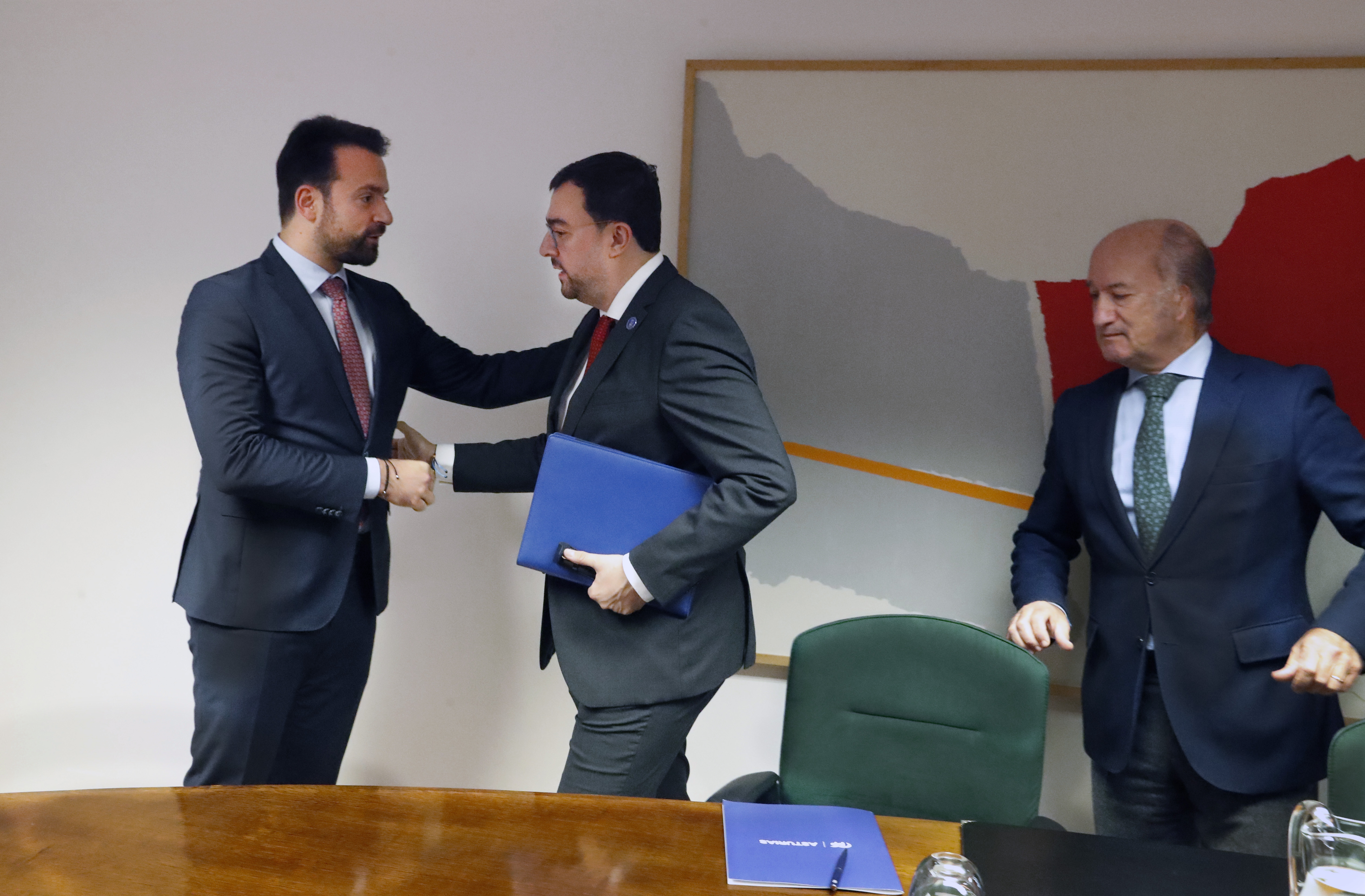 El presidente del Principado, Adrián Barbón, saluda al portavoz del Partido Popular en la Junta General, Álvaro Queipo, en presencia del diputado popular Luis Venta.