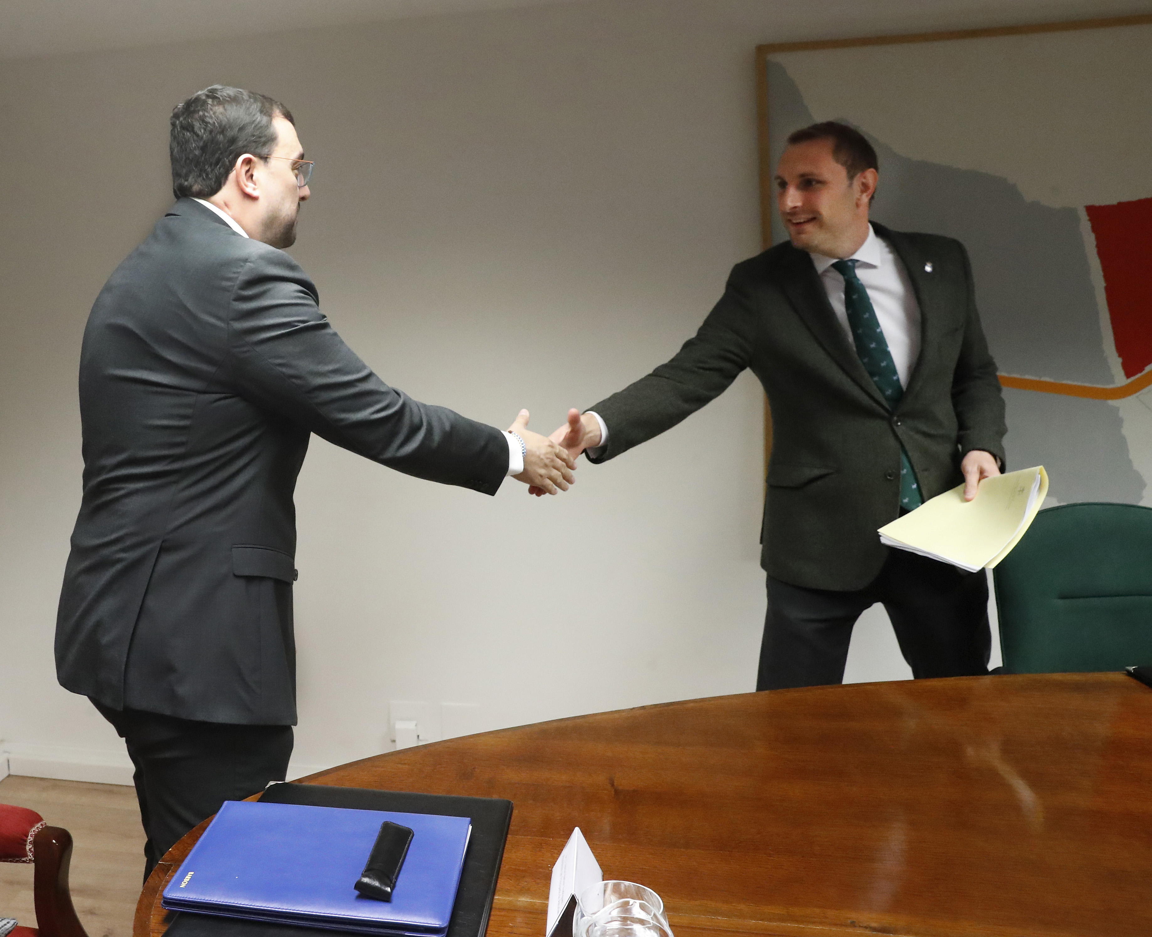 El presidente del Principado, Adrián Barbón, saluda al diputado del Grupo Mixto y portavoz de Foro Asturias, Adrián Pumares.