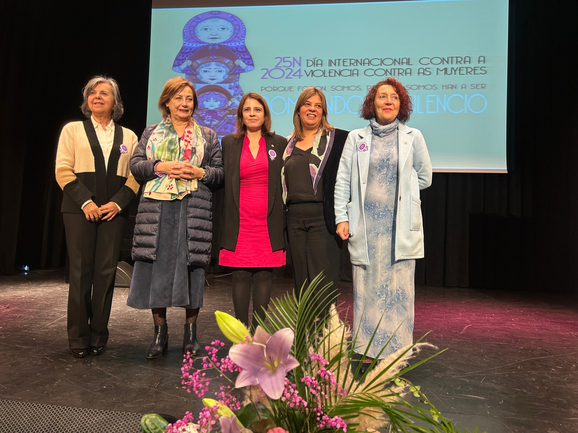 De izquierda a derecha, la directora general de Igualdad, María Jesús Álvarez; la alcaldesa de Avilés, Mariví Monteserín; la delegada del Gobierno en Asturias, Adriana Lastra; la vicepresidenta del Principado, Gimena Llamedo, y la presidenta de la Federación Asturiana de Concejos (FACC) y alcaldesa de El Franco, Cecilia Pérez, en el acto institucional.