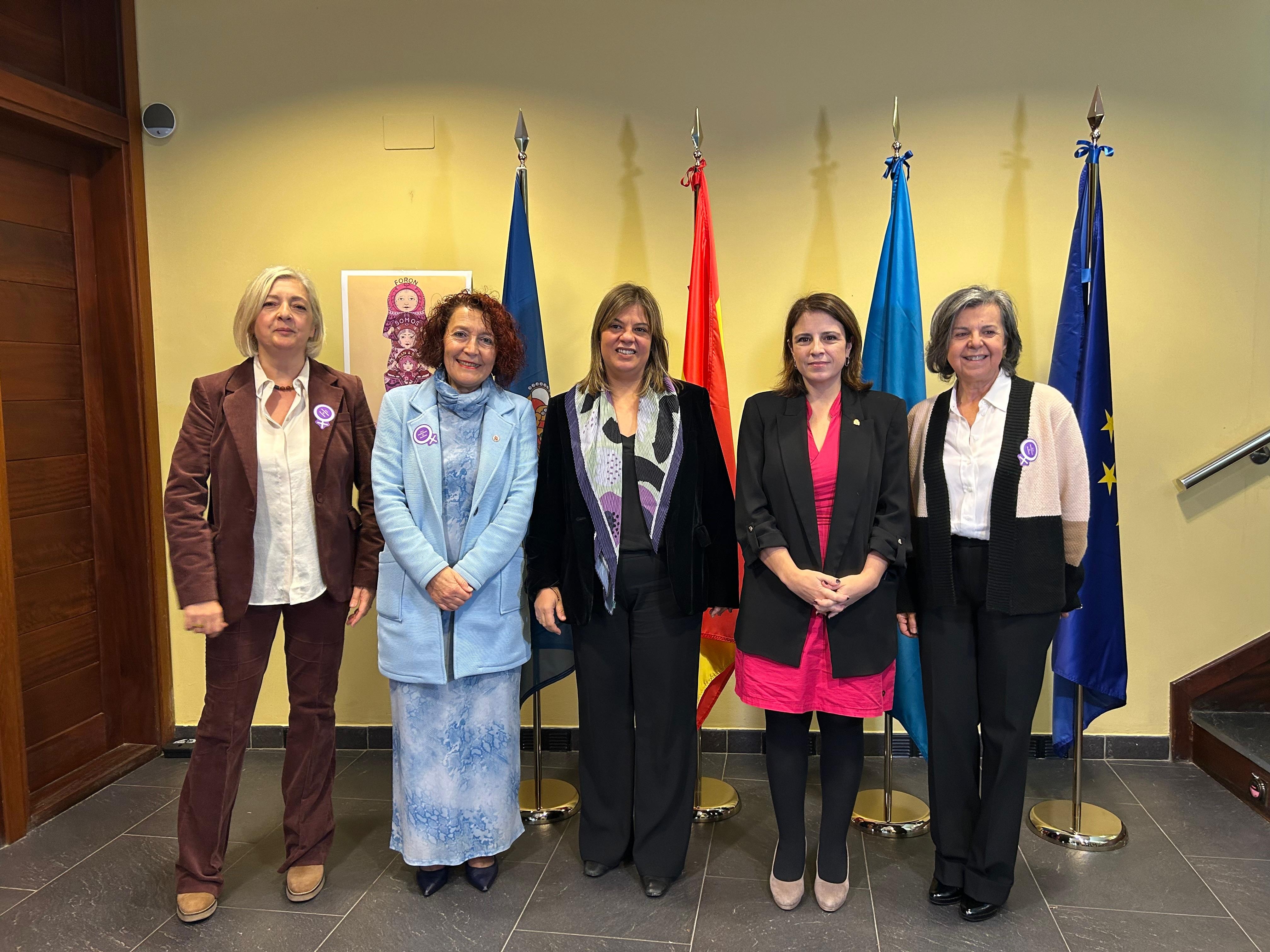De izquierda a derecha, la concejala de Igualdad de El Franco, Victoria Zarcero; la presidenta de la Federación Asturiana de Concejos (FACC) y alcaldesa de El Franco, Cecilia Pérez; la vicepresidenta del Principado, Gimena Llamedo; la delegada del Gobierno en Asturias, Adriana Lastra, y la directora general de Igualdad, María Jesús Álvarez.