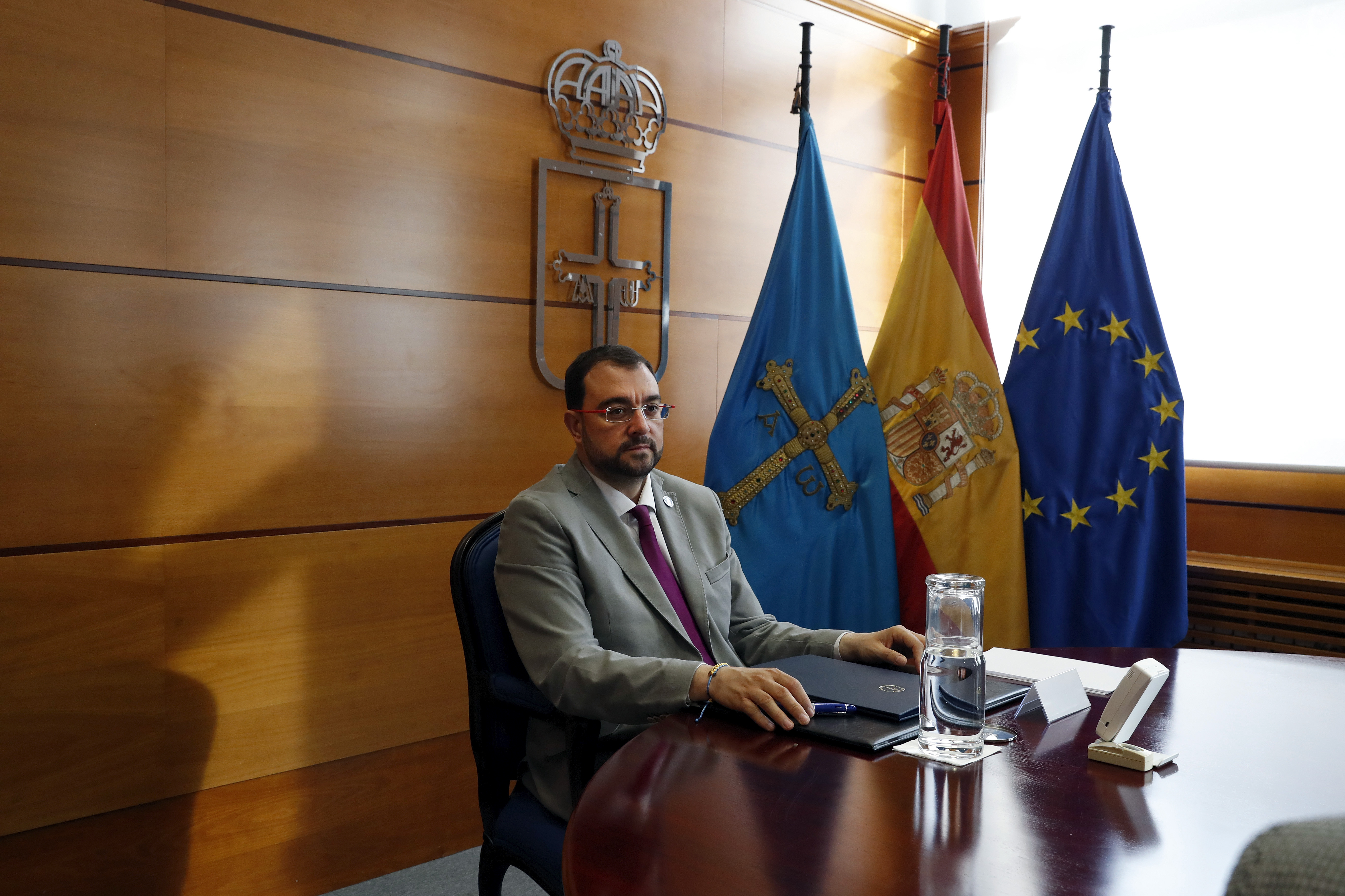 El presidente del Principado, Adrián Barbón, esta mañana, a su llegada a la reunión semanal del Consejo de Gobierno.