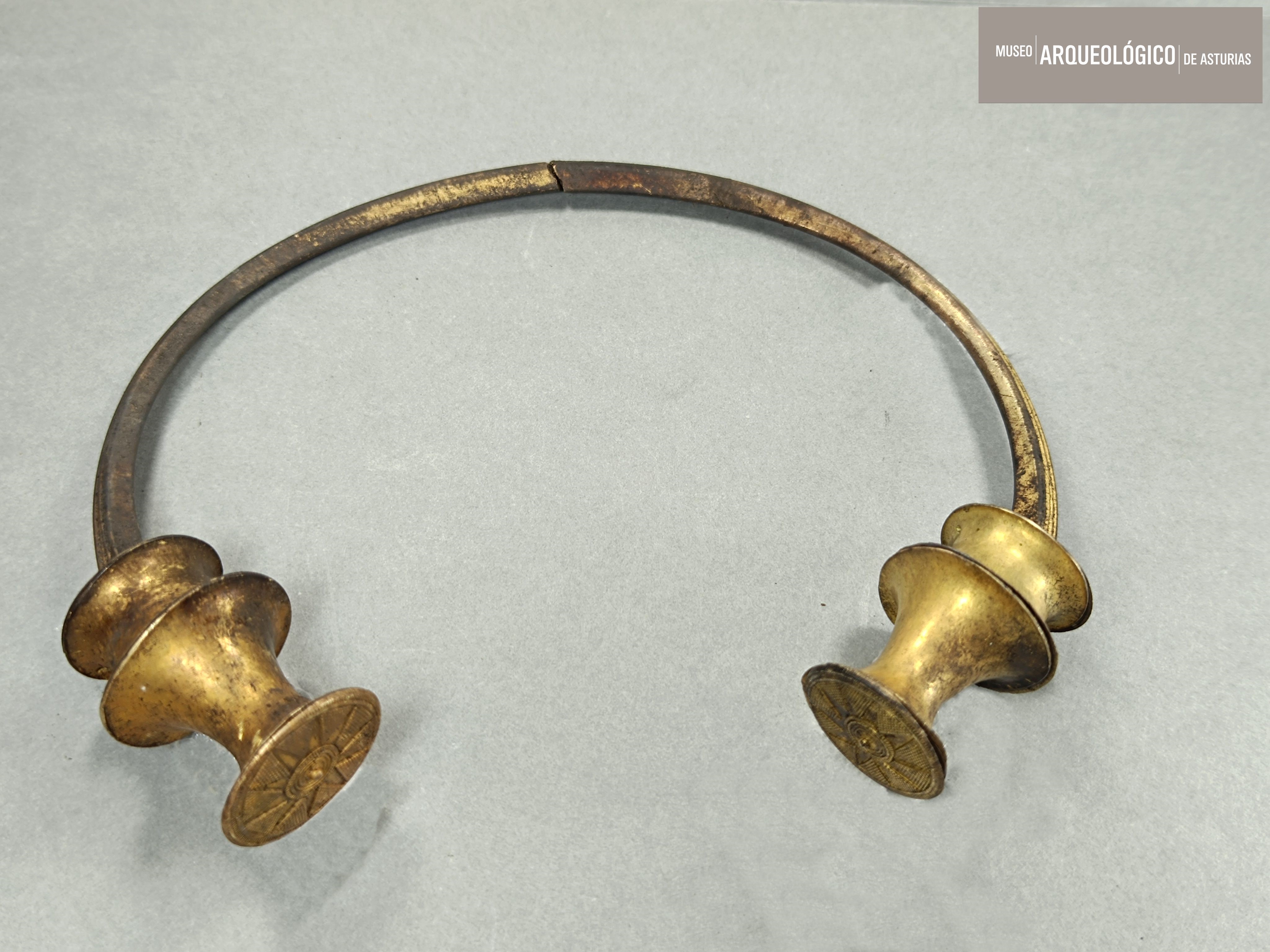 Collar rígido de superficie dorada que puede asimilarse al conjunto de torques denominados de manera genérica como astur-norgalaico, caracterizados por varillas con remates en doble escocia y decoraciones que desarrollan motivos ornamentales geométricos.