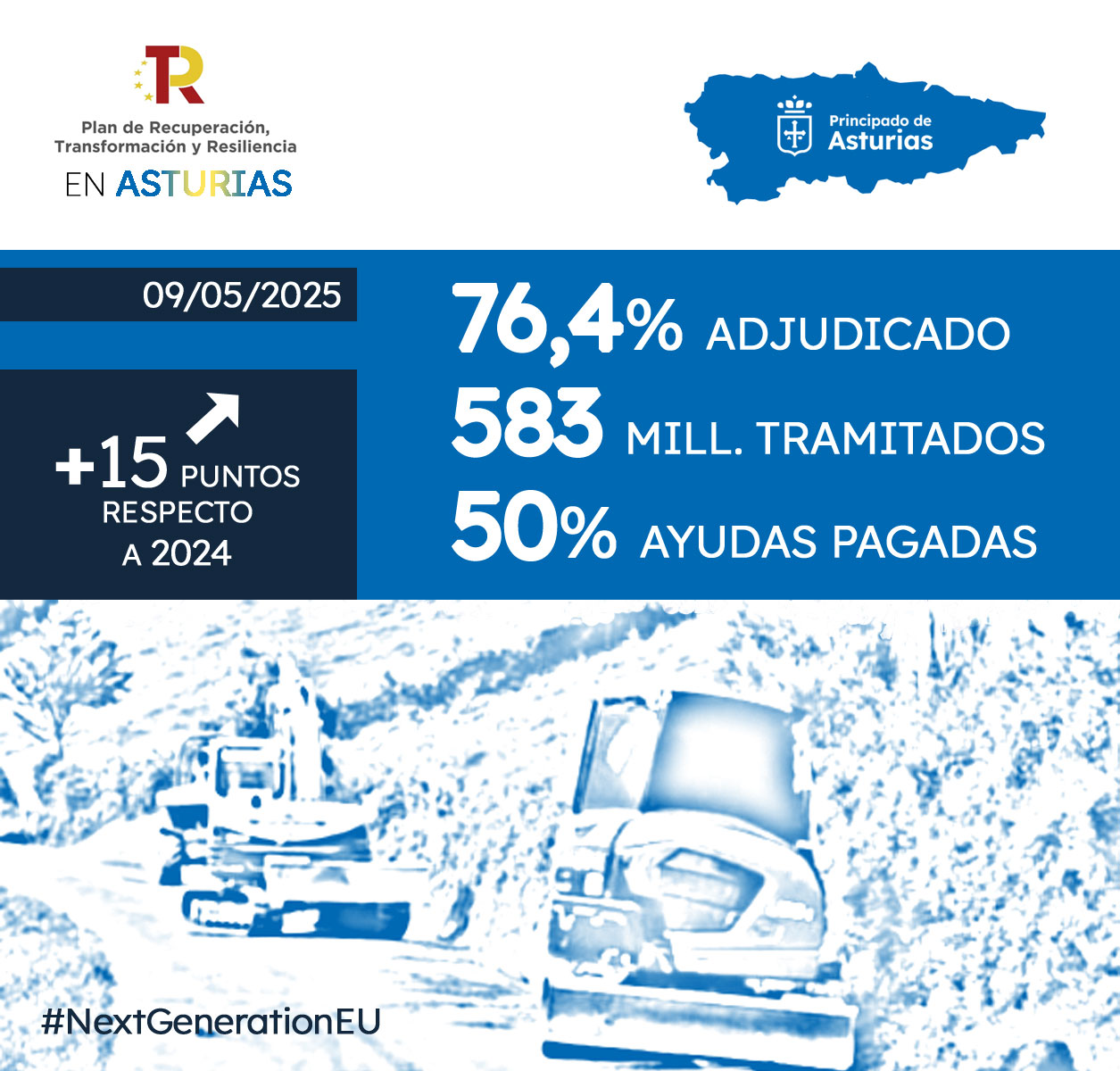 El Gobierno de Asturias ha superado ya el 75% de fondos adjudicados dentro del paquete que ha recibido del Mecanismo de Recuperación y Resiliencia, que suma 764 millones. En concreto, el Principado ha tramitado 583,6 millones, el 76,4% del total, 15 puntos porcentuales más que hace un año.