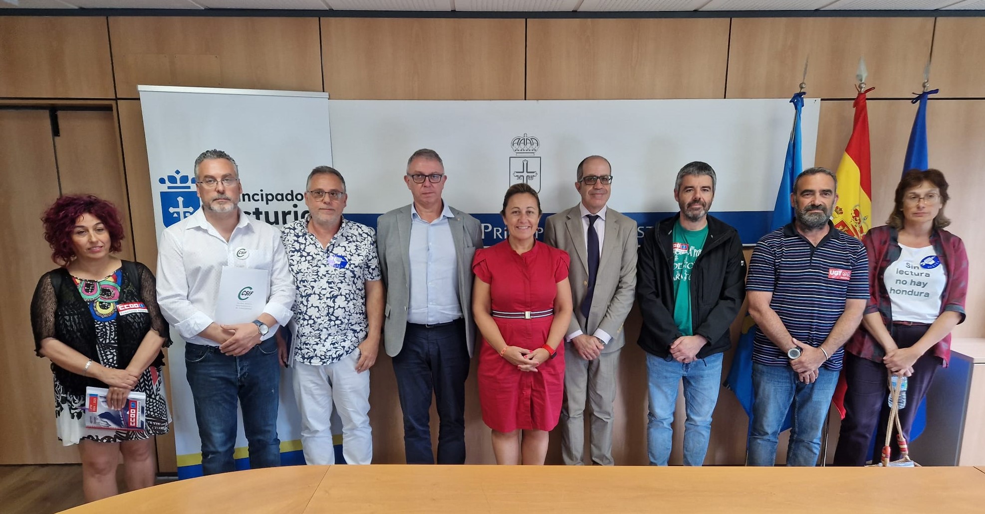 De izquierda a derecha, Susana Nanclares (CCOO); Jorge García (CSIF); Xosé Lluis Colodrón (SUATEA); el director general de Personal Docente, César González; la consejera de Educación, Lydia Espina; el director general de Empleo Público, Miguel Ángel Rodríguez; Borja Llorente (CCOO); Luis Fermín Río (UGT), y Aurora Junquera (SUATEA), instantes antes de la firma del acuerdo de desconvocatoria de la huelga.