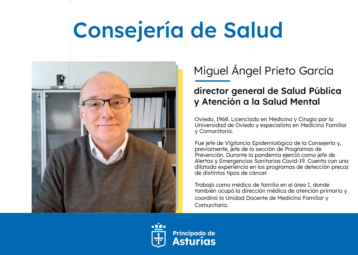 Miguel Ángel Prieto (Oviedo, 1968) es licenciado en Medicina y Cirugía por la Universidad de Oviedo y especialista en Medicina Familiar y Comunitaria. Hasta ahora ha sido jefe de Vigilancia Epidemiológica de la Consejería de Salud y, previamente, jefe de la sección de Programas de Prevención. Durante la pandemia ejerció como jefe de Alertas y Emergencias Sanitarias Covid-19. Cuenta con una dilatada experiencia en los programas de detección precoz de distintos tipos de cáncer. Además, trabajó como médico de familia en el área sanitaria I, con cabecera en Jarrio, donde también ocupó la dirección médica de atención primaria y coordinó la Unidad Docente de Medicina Familiar y Comunitaria.