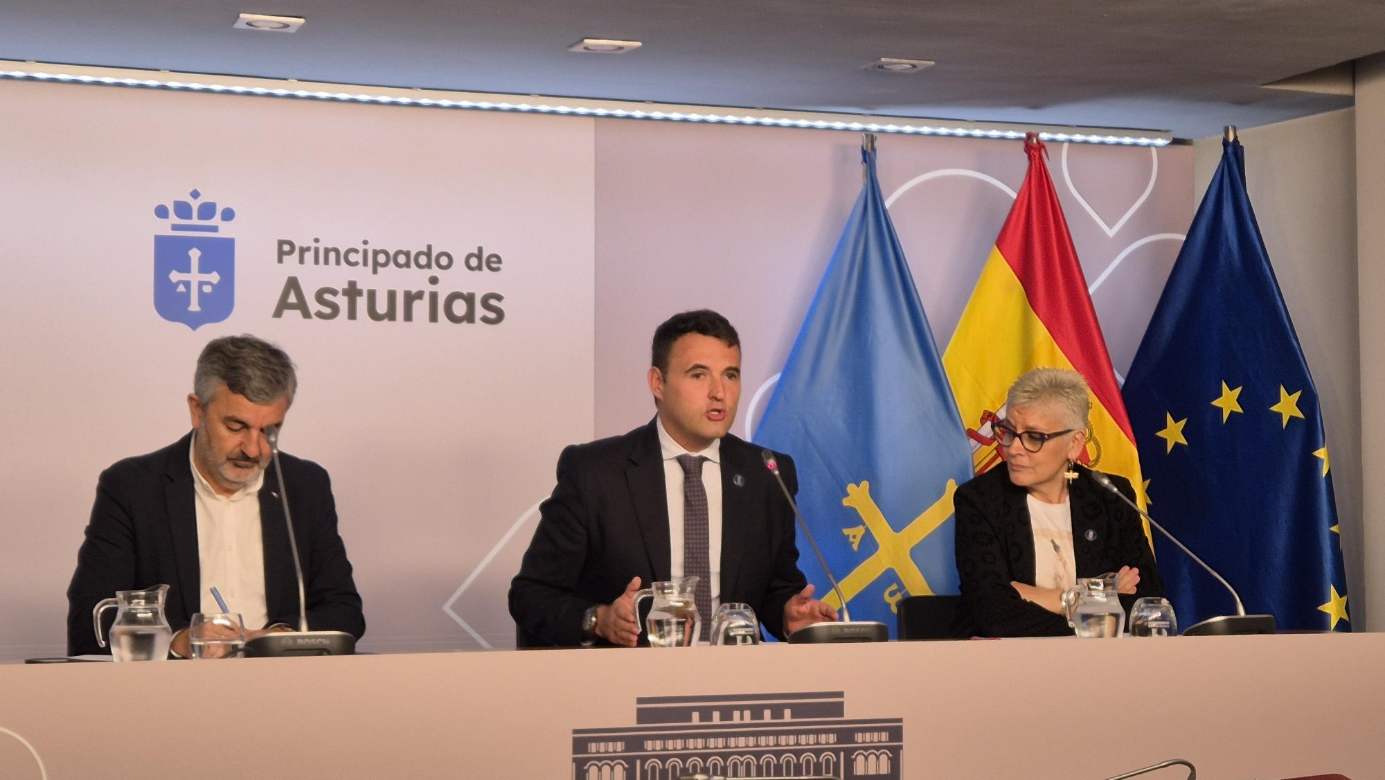 El consejero de Movilidad, Medio Ambiente y Gestión de Emergencias, Alejandro Calvo; el consejero de Hacienda, Justicia y Asuntos Europeos y portavoz, Guillermo Peláez, y la consejera de Salud, Concepción Saavedra, en la rueda de prensa del Consejo de Gobierno.