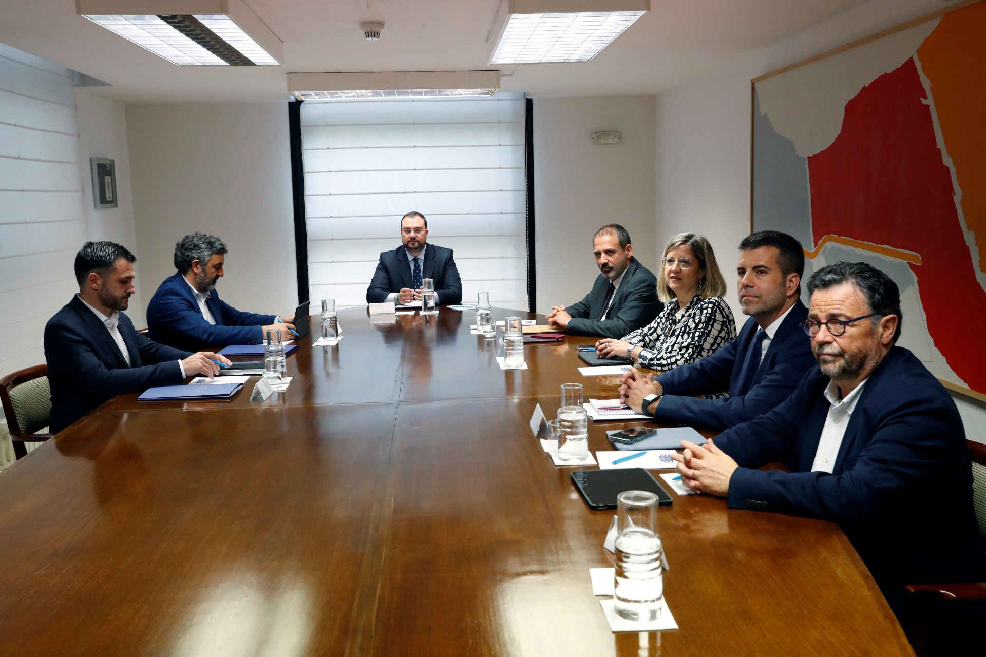 De izquierda a derecha, el viceconsejero de Infraestructuras, Movilidad y Territorio, Jorge García; el consejero de Medio Rural y Cohesión Territorial, Alejandro Calvo; el presidente del Principado, Adrián Barbón; el secretario general de Infraestructuras, Francisco Javier Flórez; la presidenta de Adif, María Luisa Domínguez; Gonzalo Pastor, adjunto a la Presidencia de Renfe, y Mariano Santiso, gerente del área Norte de Viajeros de Renfe, durante la reunión.