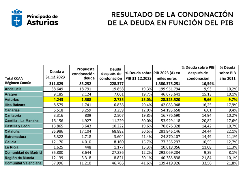Con las cifras conocidas ayer, Asturias reducirá su deuda más de un 36%, lo que permitirá recuperar capacidad financiera y regresar a los niveles de endeudamiento previos a la crisis de 2011. “Con esta propuesta de condonación de 1.508 millones, somos la tercera comunidad del país a la que más se le reduce la deuda. Es un importe muy relevante, muy notable”, ha valorado el consejero.