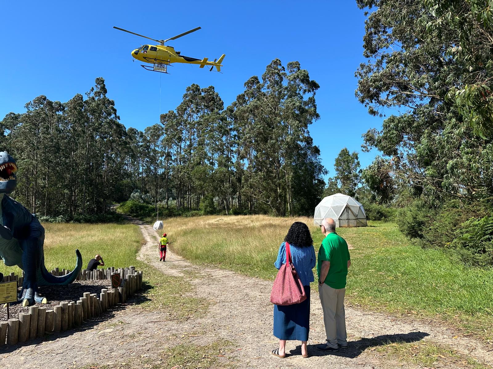 La consejera, Vanessa Gutiérrez, ha presenciado esta semana la llegada por aire de este valioso material al equipamiento de Colunga. Esta operación, de carácter excepcional, ha sido posible gracias al alto valor científico de las piezas recuperadas. Concretamente, se ha trasladado un bloque con un peso aproximado de media tonelada, que contiene varias vértebras de la cola de un dinosaurio envueltas en yeso. Previamente se habían extraído otras vértebras caudales, un pubis, un isquion, una costilla completa y cuatro chevrones (huesos en forma de ‘V’ que se encuentran en la parte inferior de la cola de algunos reptiles y mamíferos).
