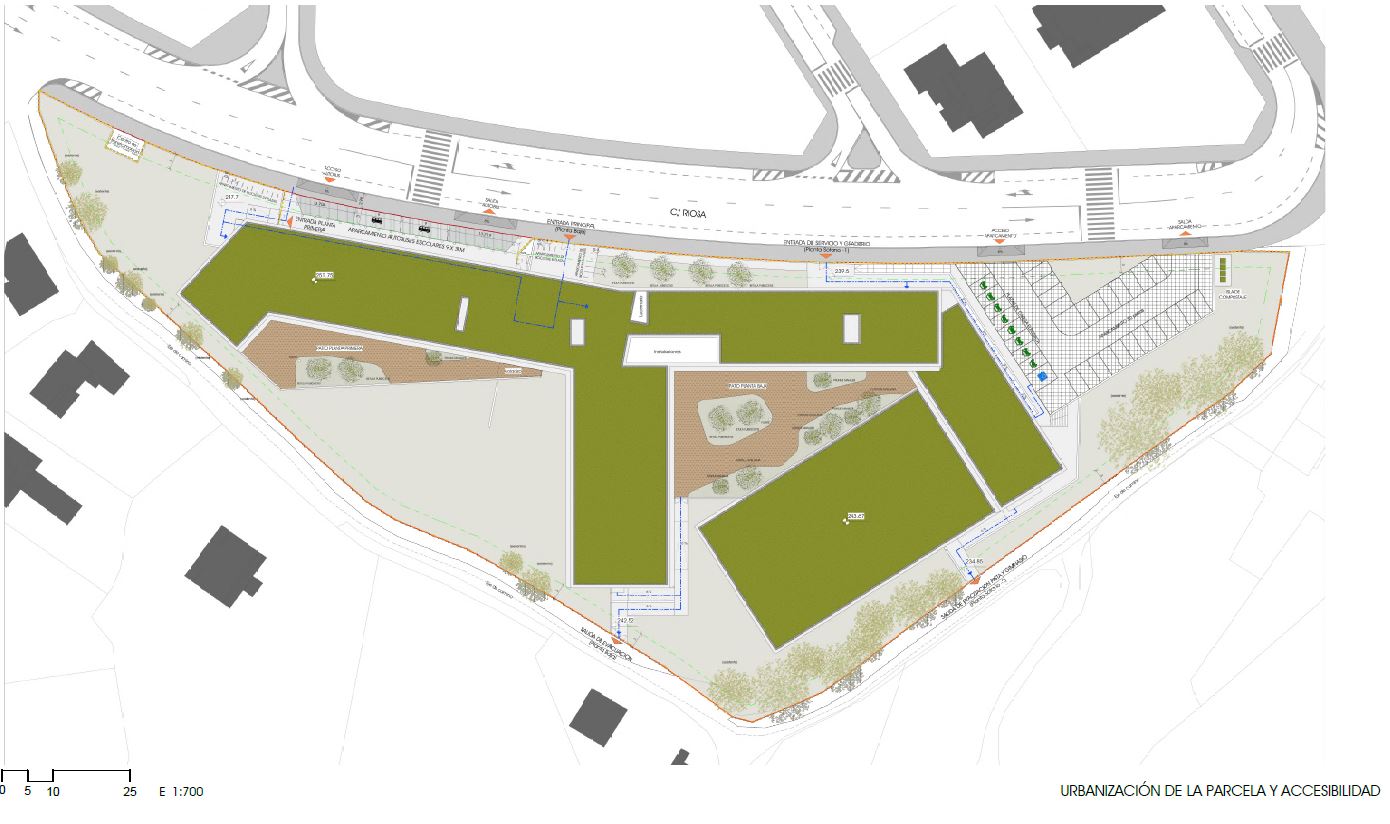 En el exterior del cierre, con entrada y salida próxima al acceso principal, habrá una dársena con capacidad para dos autobuses. Además, en la parte inferior de la parcela, se prevé un aparcamiento para 32 vehículos, con puntos de recarga para vehículos eléctricos.