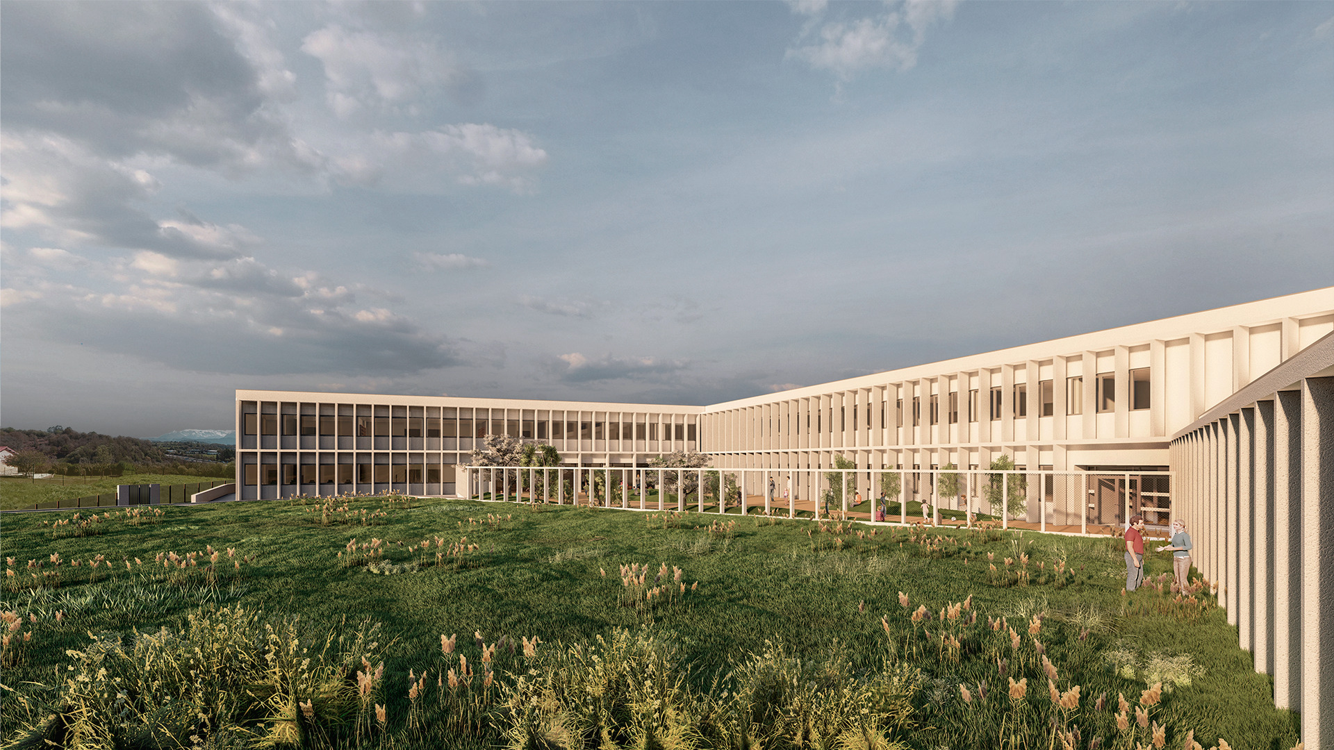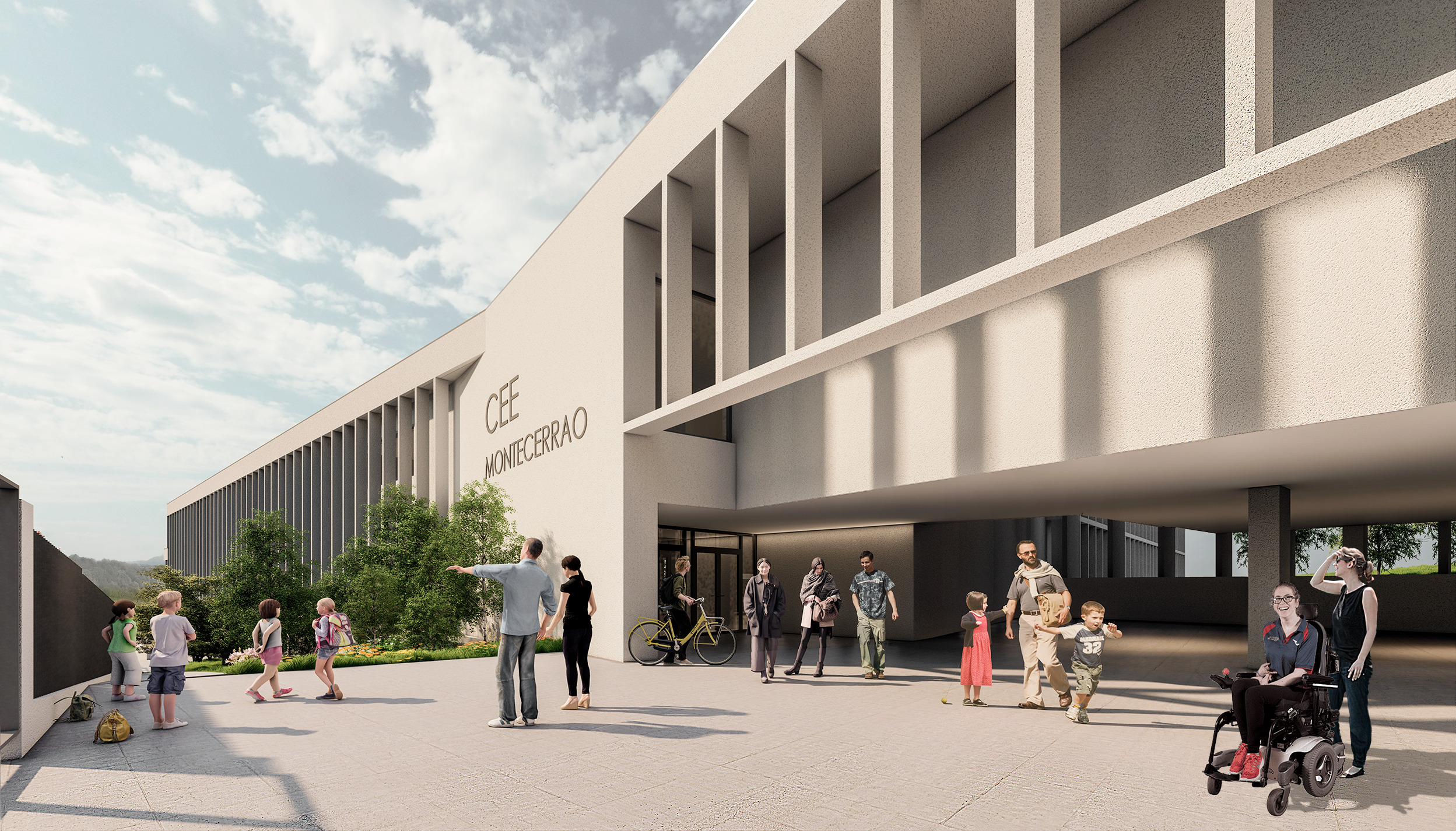 El proyecto contempla tres entradas diferentes, en el centro y los extremos del inmueble. El acceso principal se encuentra en la parte intermedia y se abre bajo un amplio porche cubierto, que conecta con las aulas y con la parte administrativa mediante rampas accesibles exteriores.