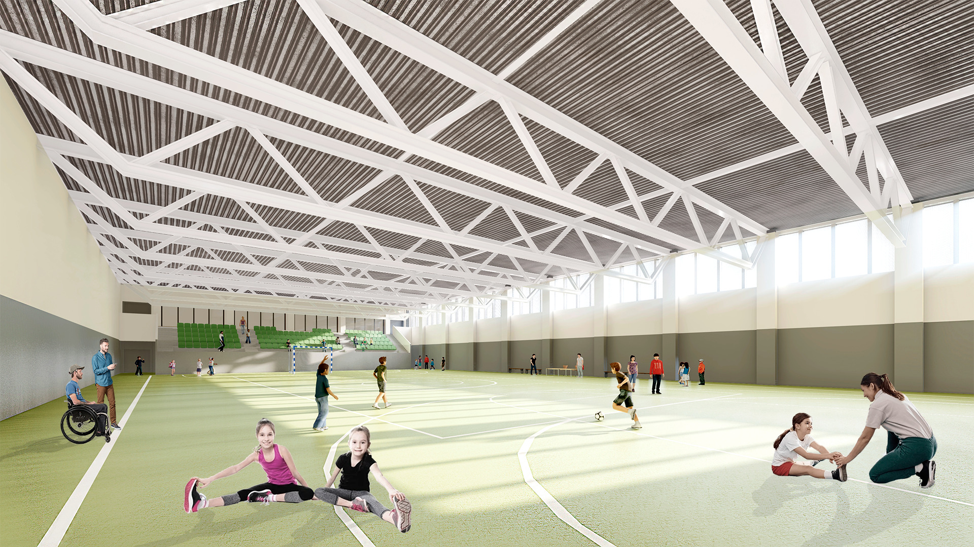 Las instalaciones deportivas se encuentran también en la parte más baja del terreno. Están semienterradas y disponen de una cubierta vegetal para mejorar su integración en el entorno. El polideportivo y el gimnasio, con sus aseos y vestuarios adaptados, cuentan con un acceso independiente.