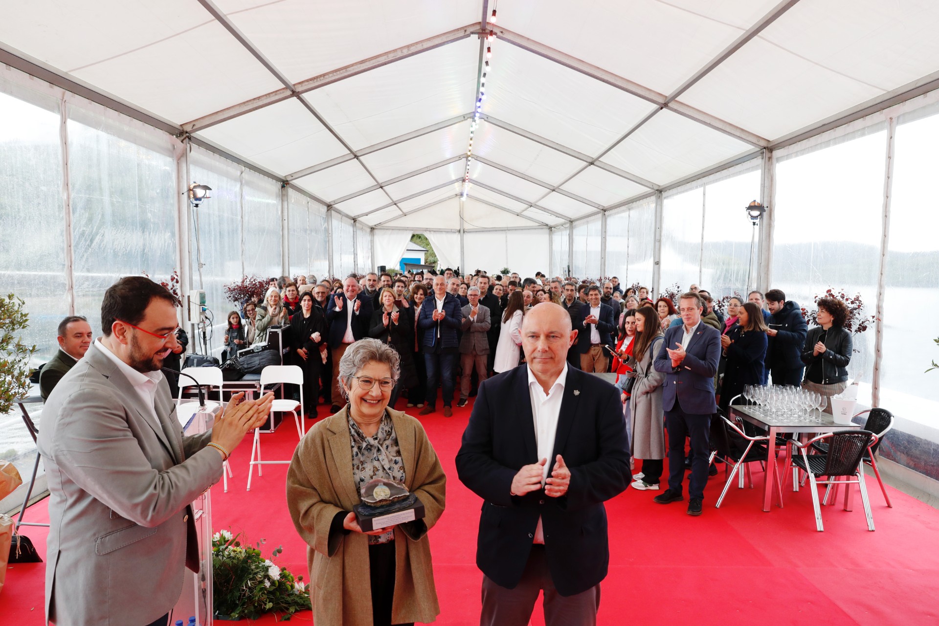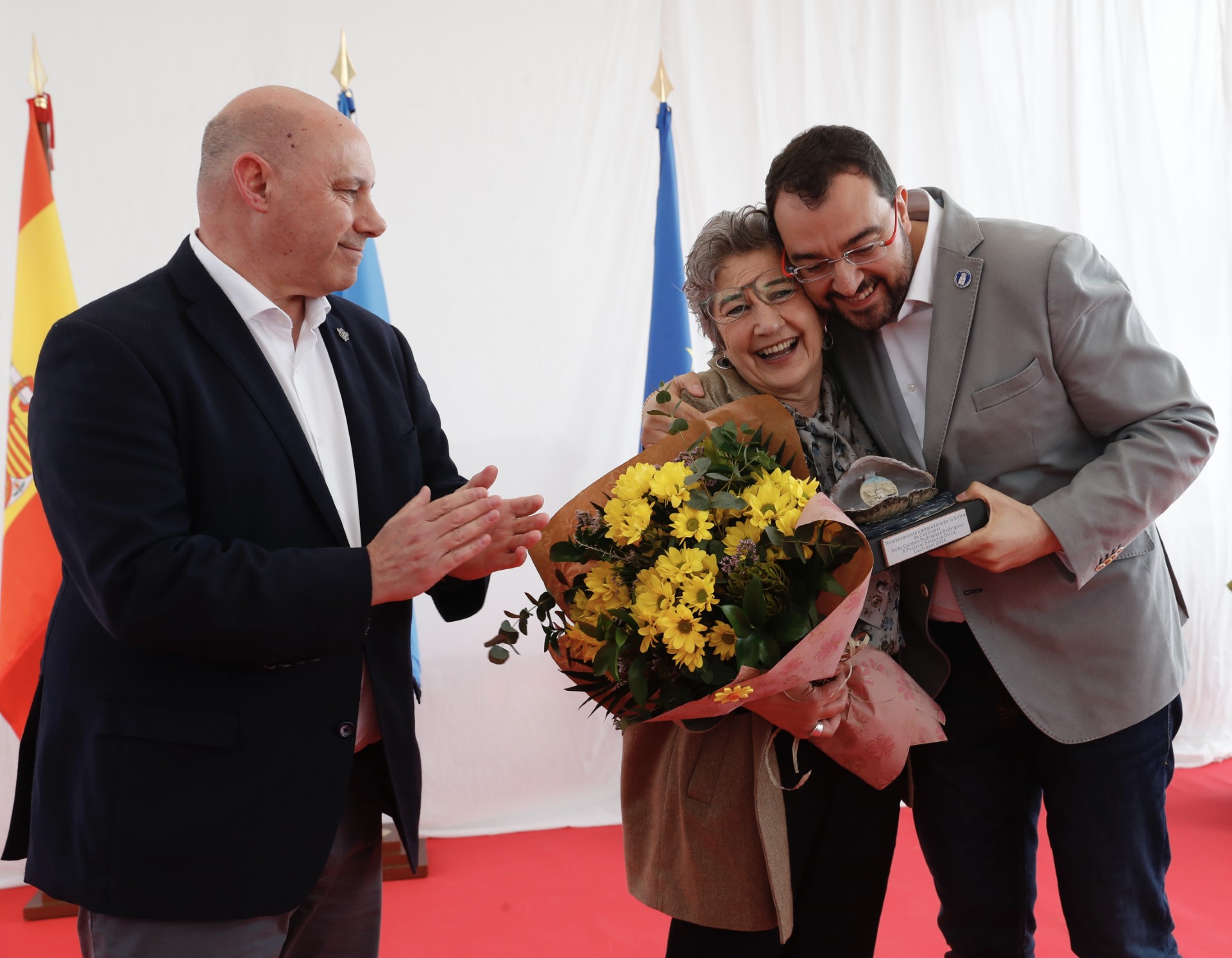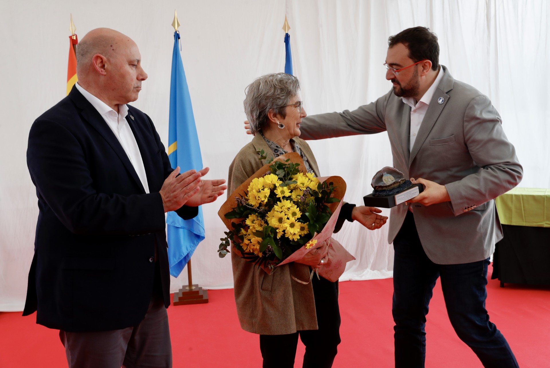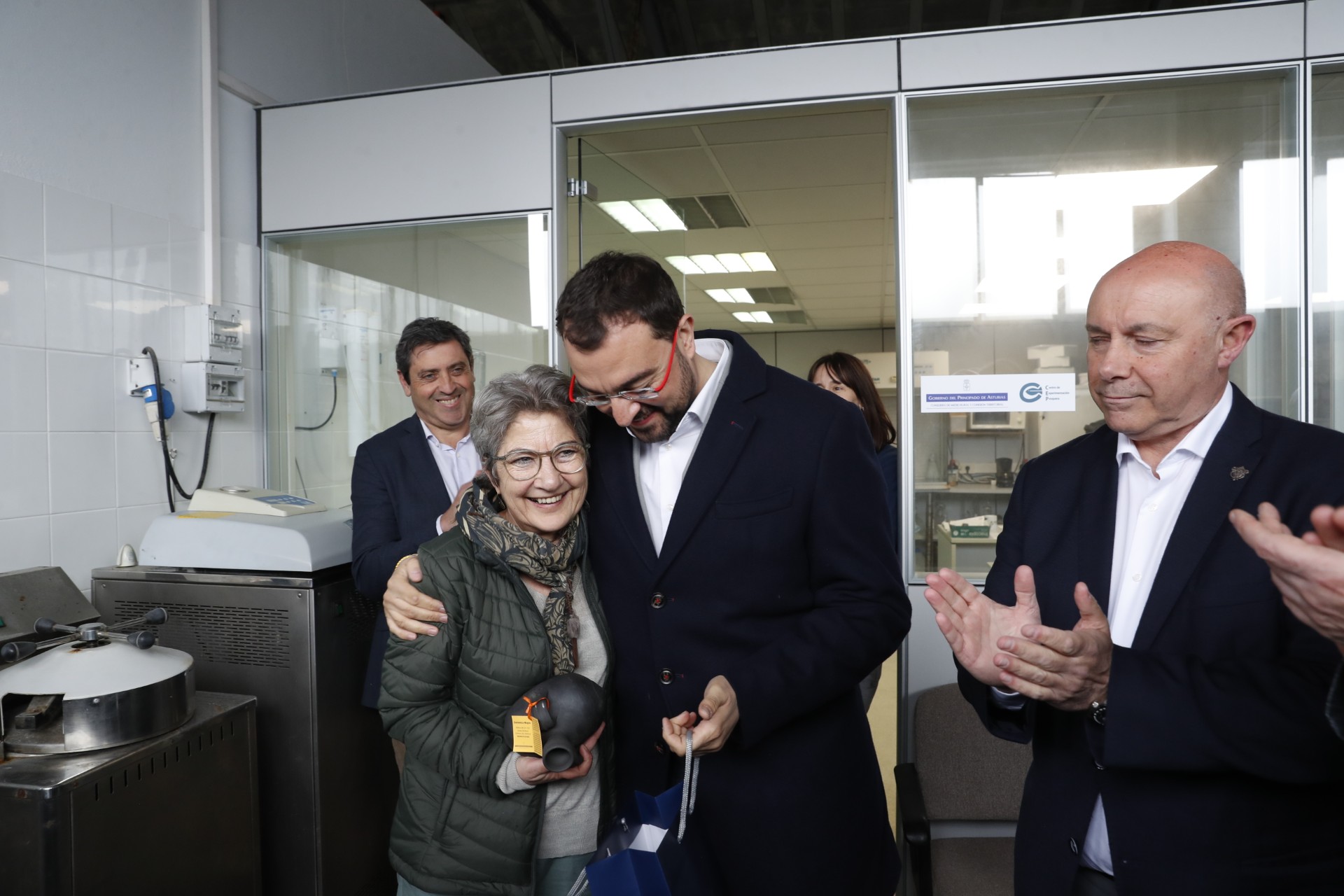 El presidente del Principado, Adrián Barbón, entrega un detalle a Carmen Rodríguez, responsable del Departamento de Acuicultura del Centro de Experimentación Pesquera de Castropol con motivo de su jubilación y su nombramiento como Embajadora de la Ostra 2024.