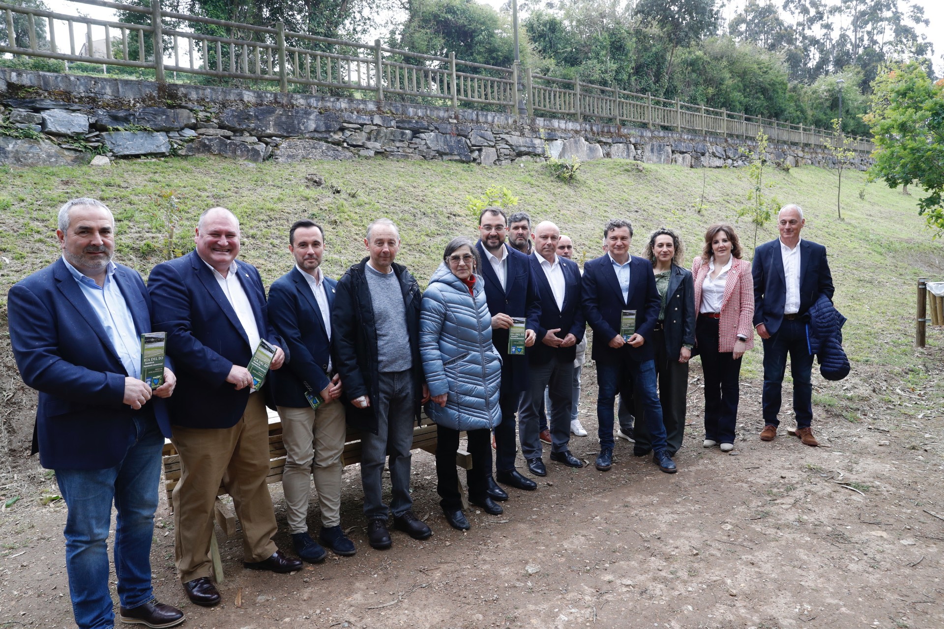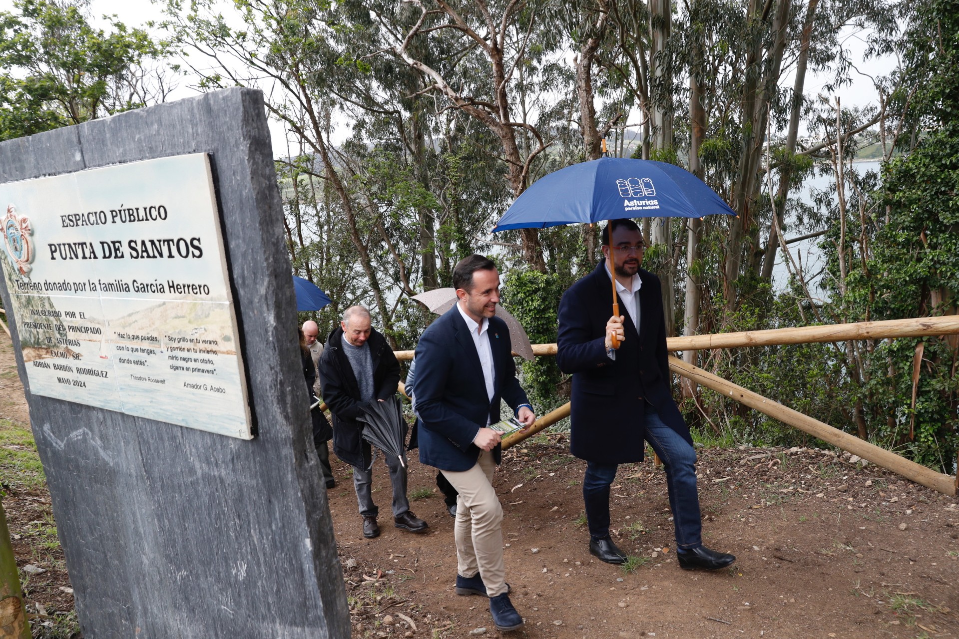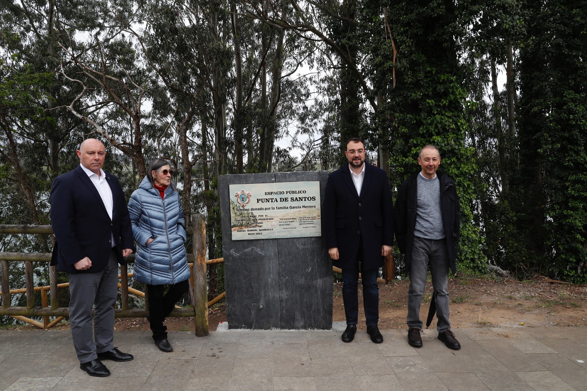 El alcalde de Castropol, Francisco Javier Vinjoy, María del Carmen García Herrero, el presidente del Principado, Adrián Barbón, y Carlos García Herrero, en la nueva área recreativa Punta de Santos, cuyos terrenos fueron cedidos al Ayuntamiento de Castropol por la familia García Herrero.