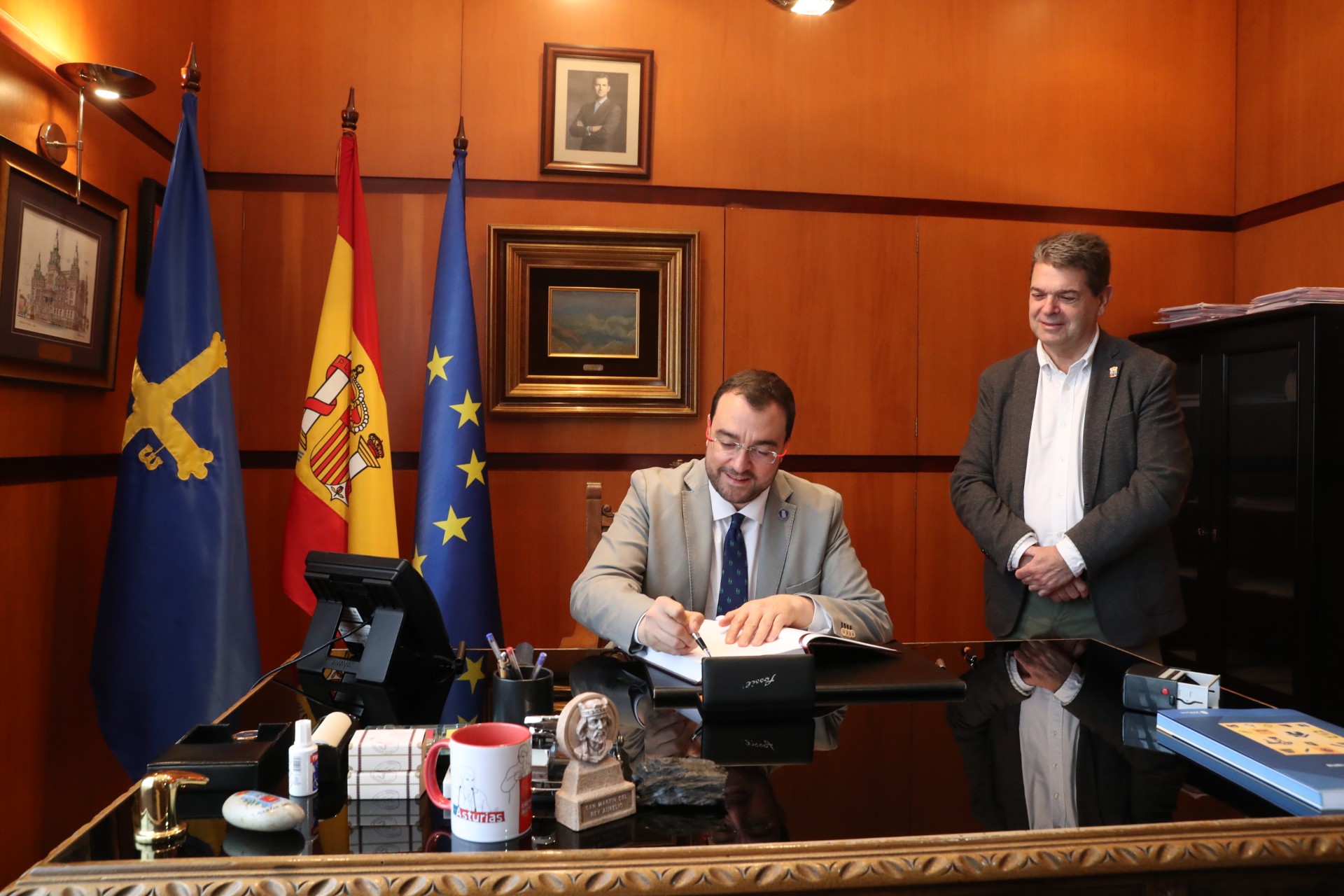 El presidente del Principado de Asturias, Adrián Barbón, firma en el libro de honor del Ayuntamiento San Martín del Rey Aurelio, antes de visitar las dependencias municipales junto con su alcalde, José Ramón Martín.