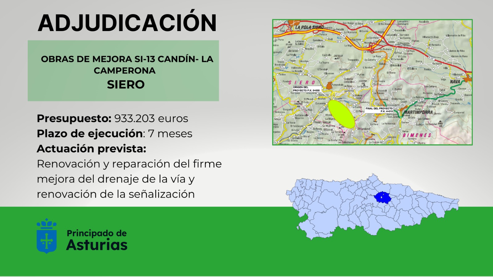 La Consejería de Fomento, Cooperación Local y Prevención de Incendios ha adjudicado en 933.203 euros, a la UTE formada por las empresas Pavitek 2010 SL y Ramadal SL, la reforma de la carretera SI-13 que une Candín y La Camperona, en el concejo de Siero. Las obras, cuyo plazo de ejecución es de siete meses, permitirán mejorar las condiciones de seguridad de la vía a lo largo de sus más de 4 kilómetros de longitud.