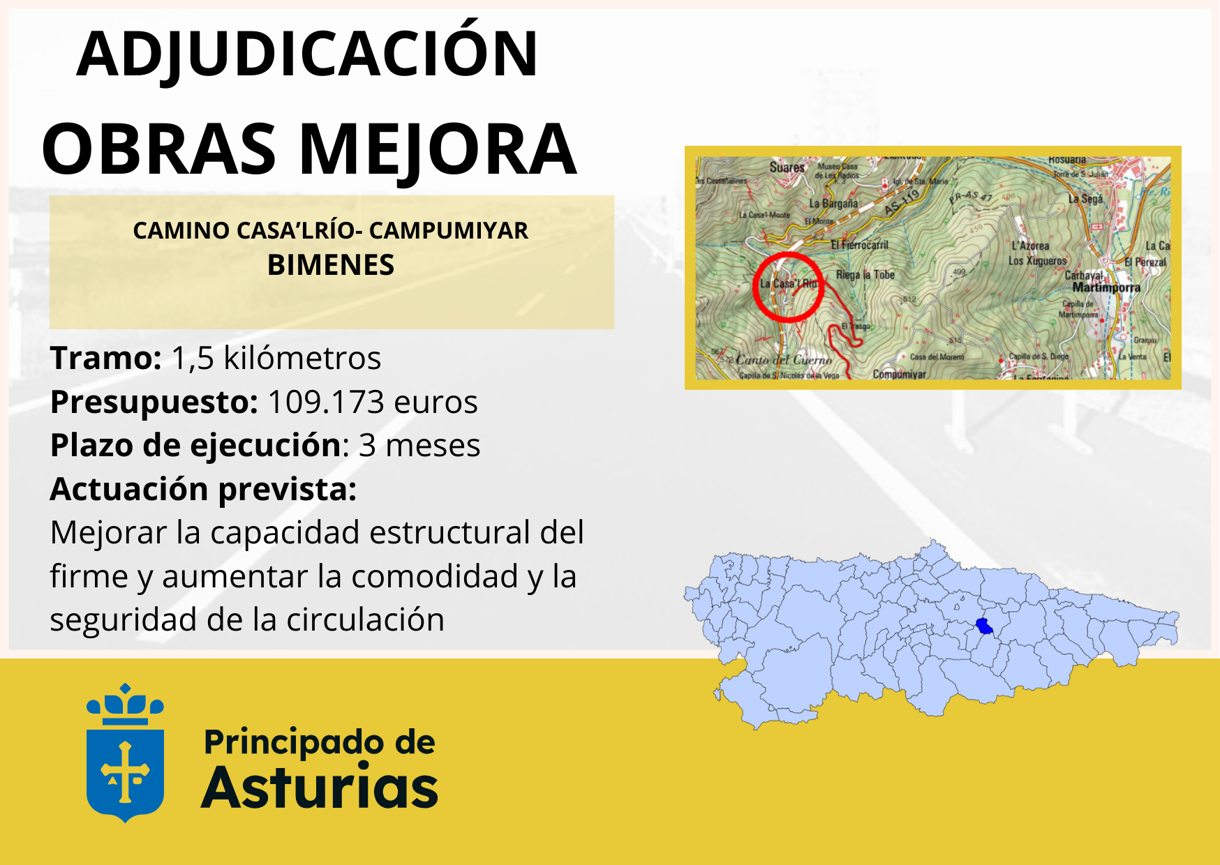 El Gobierno de Asturias ha adjudicado por 109.720 euros las obras de mejora del camino que une las localidades de Casa’l Río y Campumiyar, en Bimenes. El plazo de ejecución previsto para los trabajos es de tres meses.
