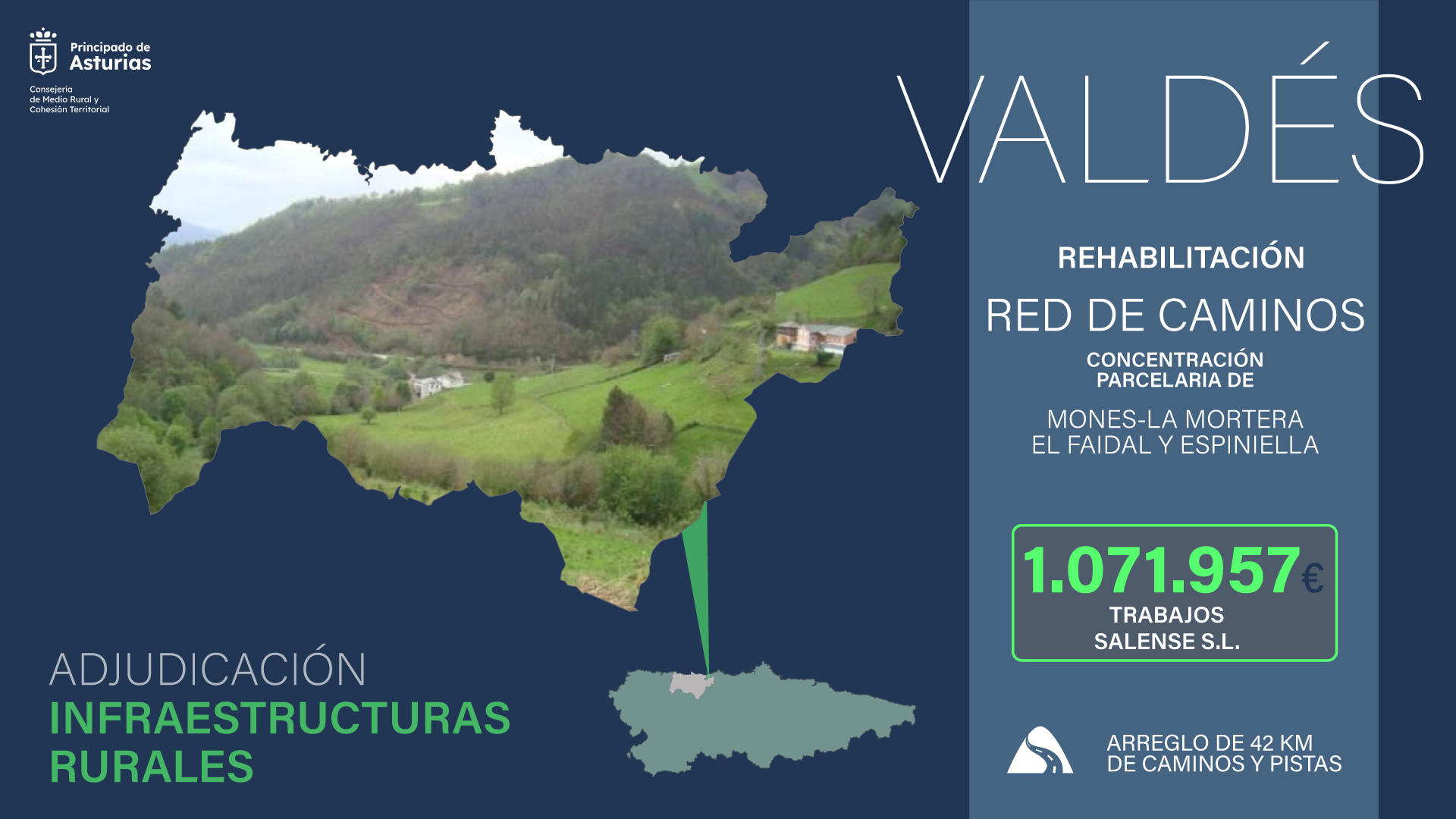La Consejería de Medio Rural y Cohesión Territorial ha adjudicado por 1.071.957 euros las obras de la red de caminos de la concentración parcelaria de Mones, La Mortera, El Faidal y Espiniella, localidades ubicadas en la parroquia de Muñás, en Valdés. La empresa adjudicataria, Trabajos Salense S.L., dispondrá de 18 meses para ejecutar la actuación, con la que se mejorará el acceso a las 850 hectáreas de prados y montes que conforman esta concentración parcelaria.