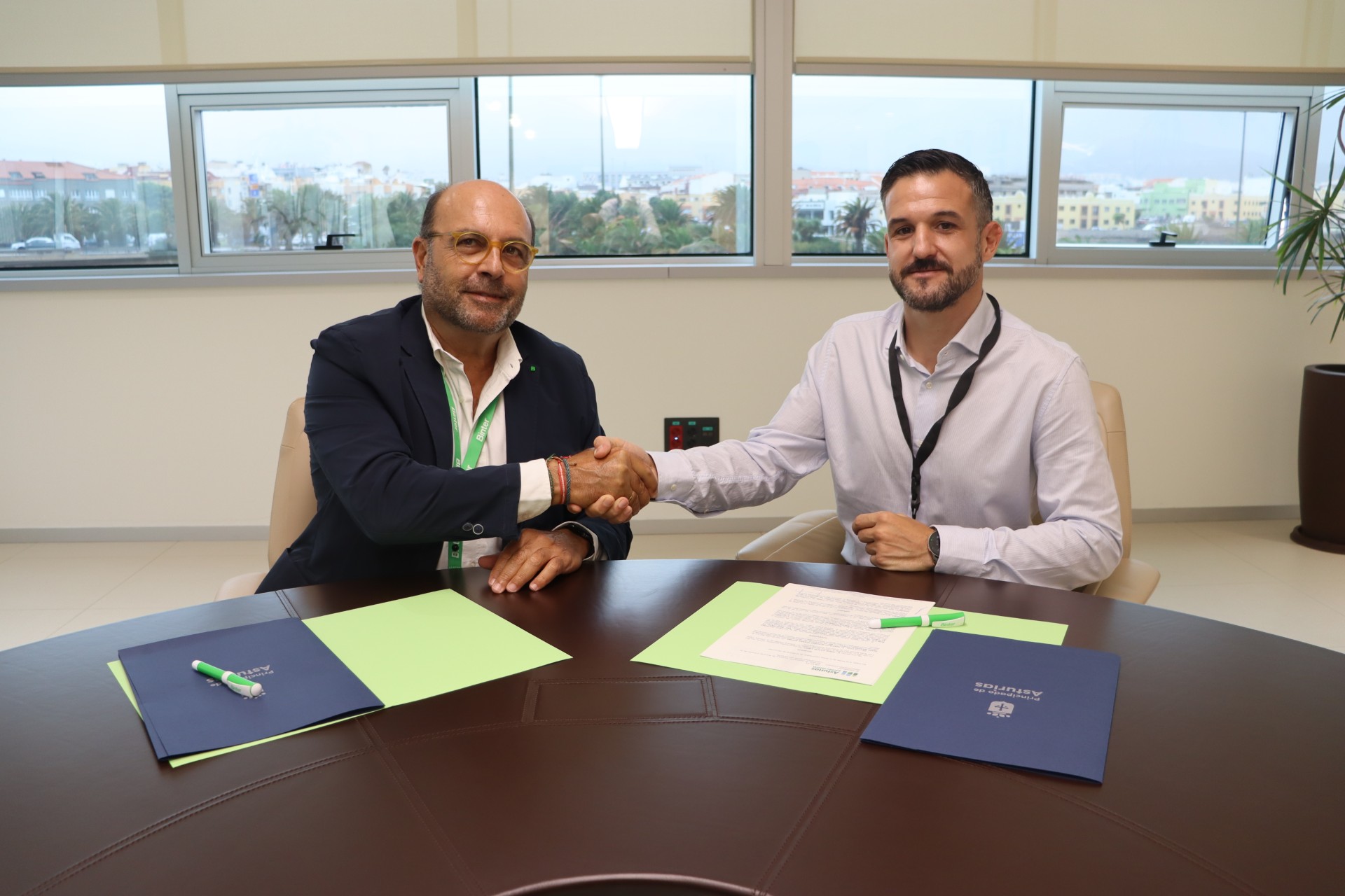 * Pie de foto: El viceconsejero de Infraestructuras y Movilidad Sostenible, Jorge García, suscribe el acuerdo promocional con Binter con Santiago Guerrero, coordinador general de Binter, esta mañana en la sede de la compañía en Gran Canaria.
