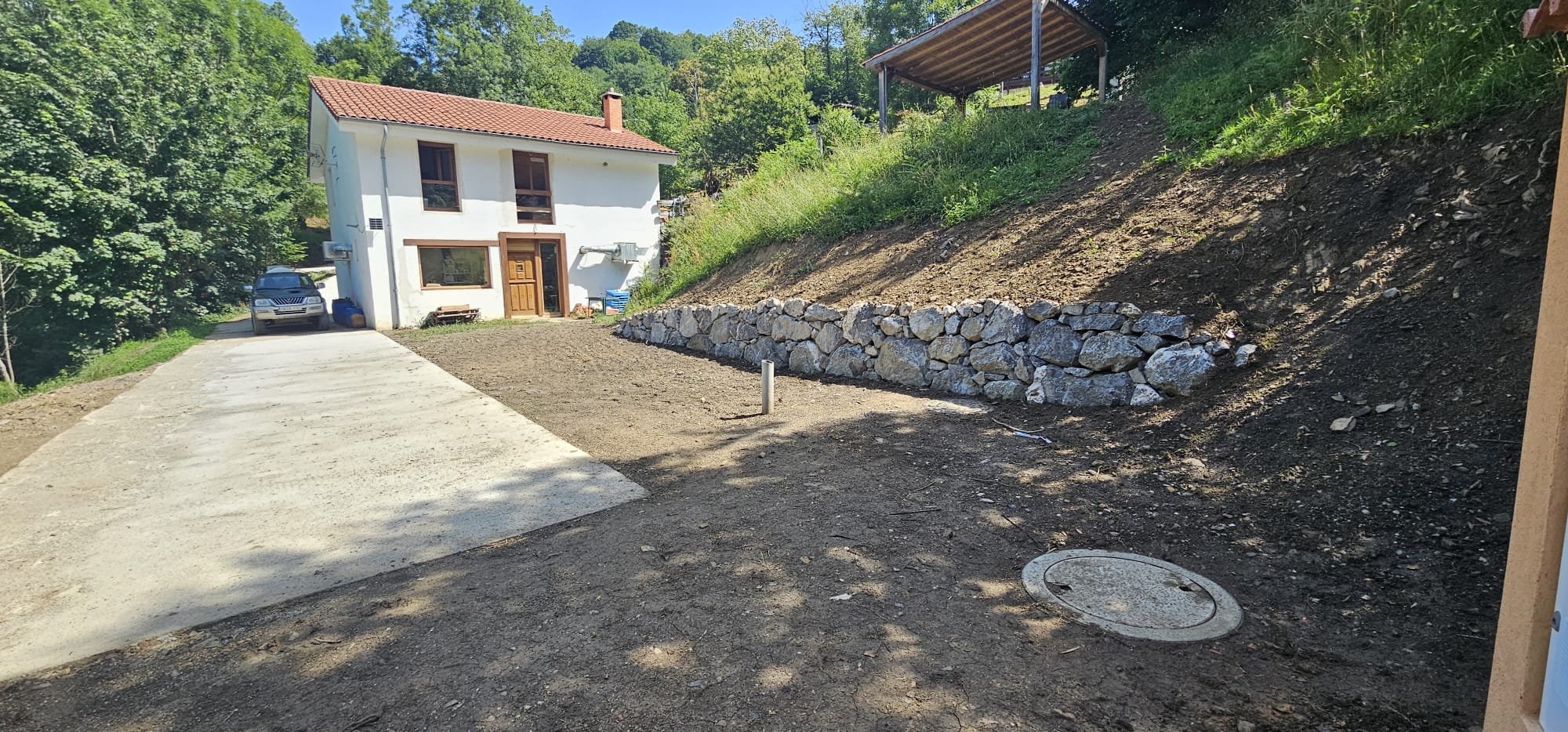 También se ha mejorado el drenaje en la entrada de la quesería, mediante la ejecución de una bajante de escollera hormigonada y la disposición de un caño de hormigón armado de un metro de diámetro.