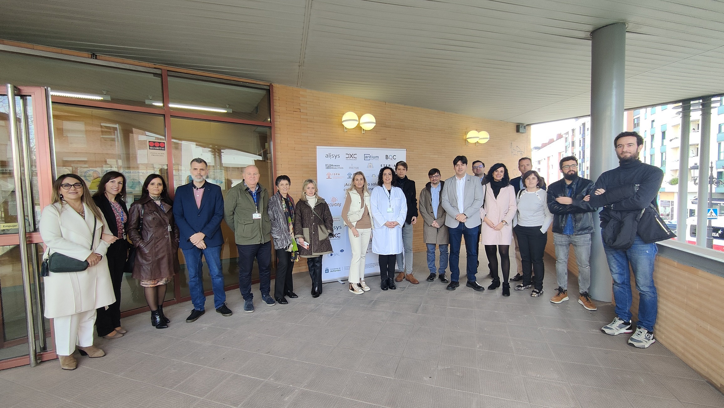 El consejero de Ciencia, Borja Sánchez; la directora del área sanitaria IV, Beatriz López; y la coordinadora del proyecto TeCuidas, Elena Fernández, con el resto de representantes de empresas e instituciones del consorcio.