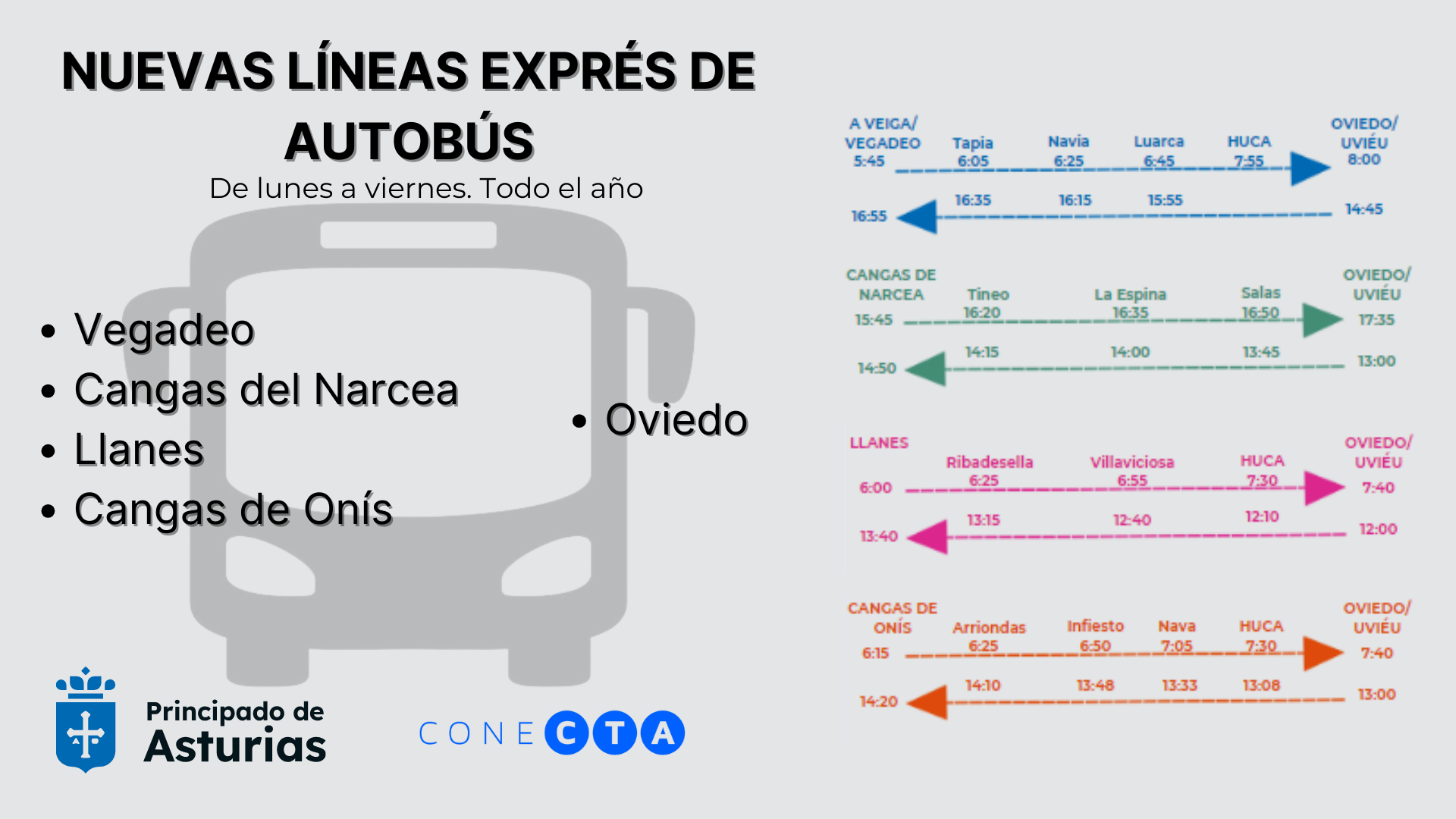 El Gobierno de Asturias pondrá en marcha a lo largo del mes de marzo cuatro líneas exprés de autobús para mejorar la conexión con Oviedo/Uviéu desde Cangues d’Onís/Cangas de Onís, Cangas del Narcea, Llanes y A Veiga/Vegadeo. Las nuevas rutas acortarán tiempos de viaje, al reducir el número de paradas intermedias, y facilitarán la conexión de las alas con la capital asturiana, principalmente a primera hora y en puntos estratégicos como el Hospital Universitario de Central de Asturias (HUCA).