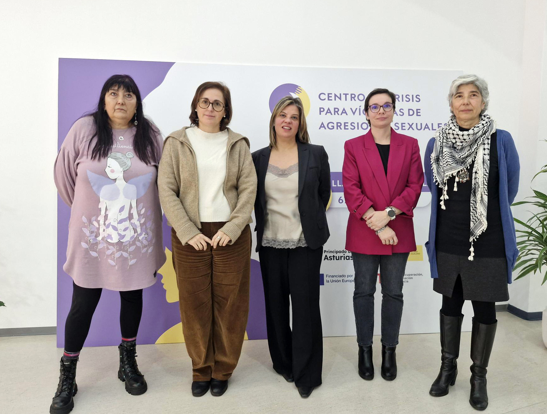 * En la imagen (de izqda. a dcha.): Victoria Carbajal, coordinadora del centro; Diana García, responsable ejecutiva de Amnistía Internacional Asturias; Gimena Llamedo, vicepresidenta; Vanesa Fernández, directora general de Igualdad, y Ana Herrero, responsable de Relaciones Institucionales de Amnistía Internacional Asturias.