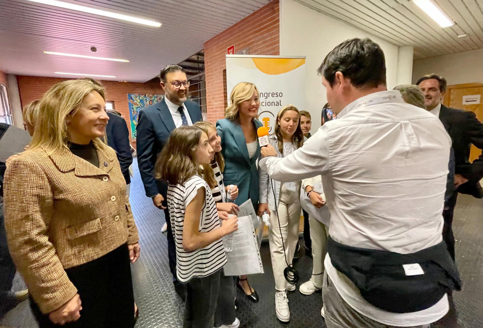 En la imagen, un grupo de escolares entrevista a la ministra de Educación, Formación Profesional y Deportes, Pilar Alegría, en presencia de los consejeros Lydia Espina, y el consejero de Educación, Cultura y Deportes de la Junta de Comunidades de Castilla-La Mancha, Amador Pastor.