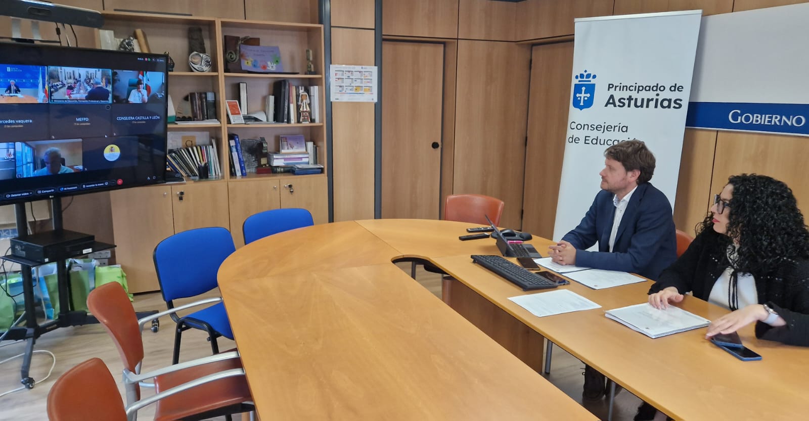 *La consejera de Cultura, Política Llingüística y Deporte, Vanessa Gutiérrez, en sus funciones como consejera de Educación, junto al director general de Inclusión Educativa y Ordenación, David Artime, en la reunión telemática de la Conferencia Sectorial de Educación.