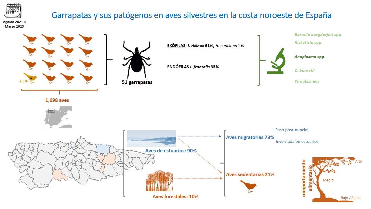 Un estudio realizado durante dos años por el equipo de Sanidad Animal del Servicio Regional de Investigación y Desarrollo Agroalimentario (Serida) concluye que en Asturias hay una baja incidencia de aves migratorias parasitadas por garrapatas, lo que contribuye a reducir el riesgo de transmisión de enfermedades como la borreliosis de Lyme por esta vía. Concretamente, de los 1.698 ejemplares analizados, tan solo un 2,5% portaban garrapatas y únicamente uno de estos parásitos estaba infectado por un organismo patógeno.