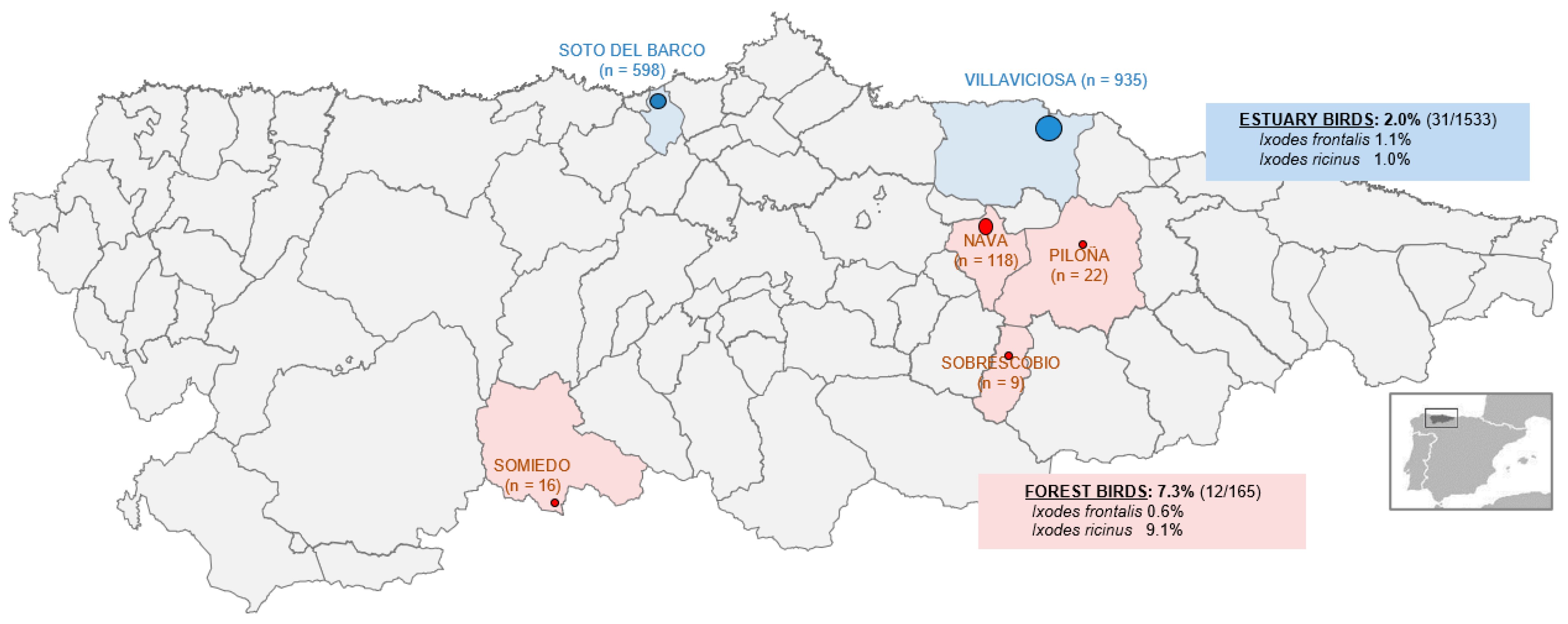 Para el desarrollo de este estudio, además del equipo de Sanidad Animal, compuesto por Alberto Espí, Ana del Cerro y Aitor Somoano, se ha contado con la participación del Grupo Ibérico de Anillamiento Asturias-Torquilla. “Hemos aprovechado el trabajo habitual de este grupo para examinar durante dos años las aves anilladas, tanto en zonas de estuarios como en áreas boscosas, y recoger las garrapatas que pudieran portar”, señala Espí, que también destaca que en las zonas forestales hay mayor porcentaje de aves infectadas que en los estuarios.