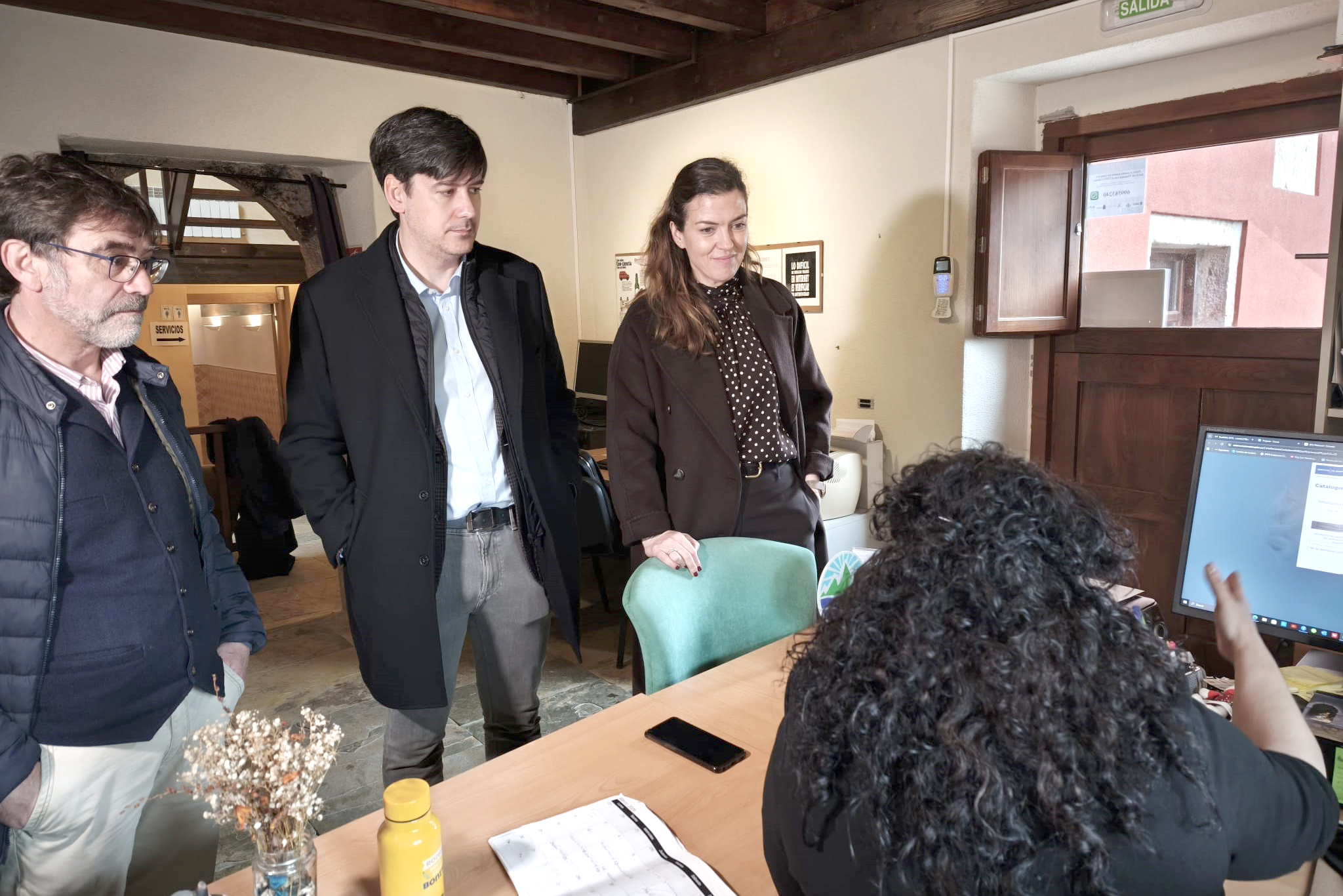 El consejero de Ciencia, Industria y Empleo, Borja Sánchez, y la directora del Sepepa, Begoña López, y el alcalde de Cabrales, José Sánchez Díaz, han visitado esta mañana el telecentro de Carreña, en Cabrales, que presta servicios de atención y apoyo a las personas que precisan información o realización de trámites sobre formación o empleo.