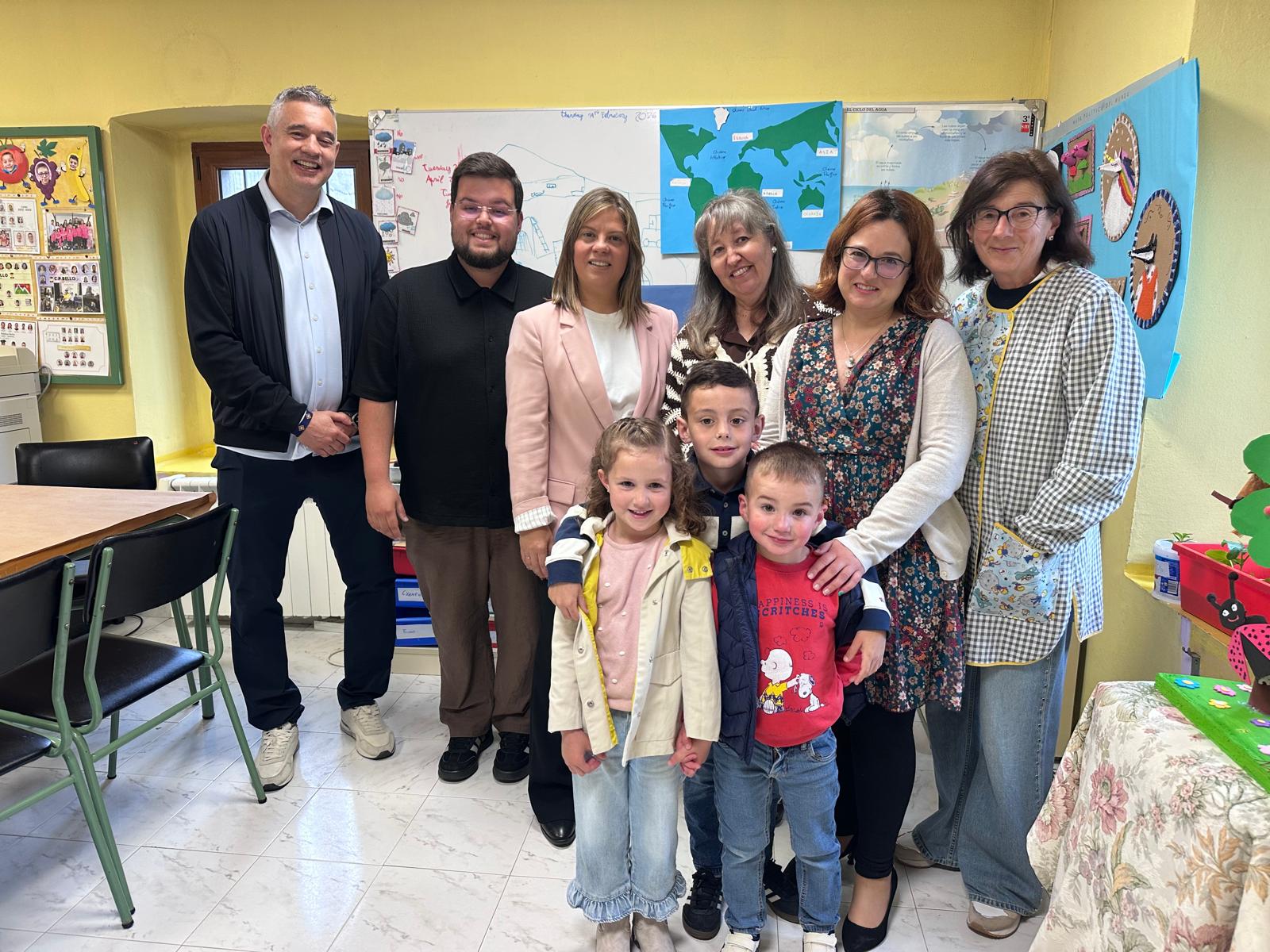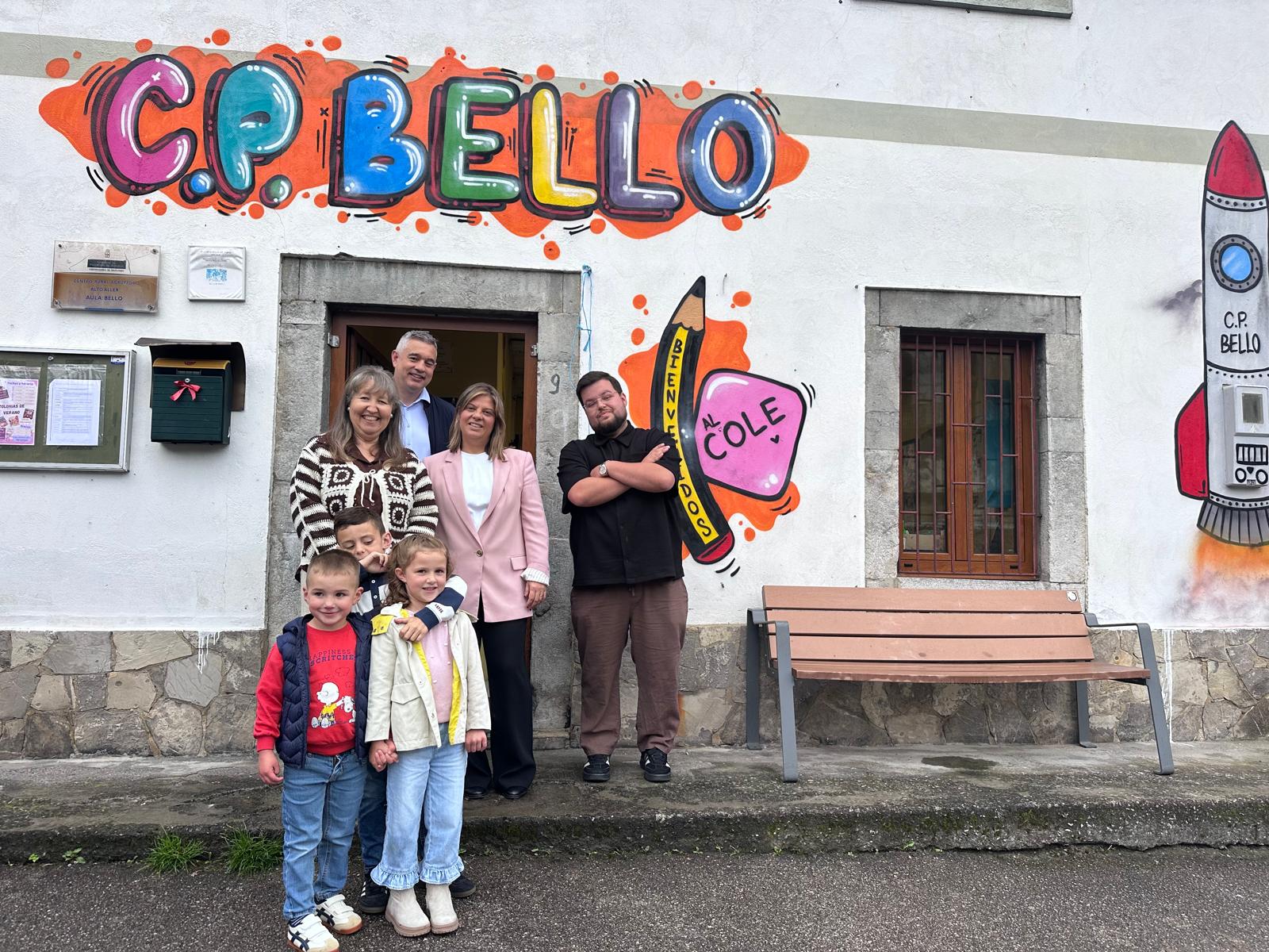 * Pie de foto: La vicepresidenta del Gobierno, Gimena Llamedo; la directora del CP Bello, Carmen Alonso; el decano de Formación del Profesorado, Celestino Rodríguez; el alumno de la Universidad seleccionado por el programa Erasmus Rural, Neftalí Reyes, y tres alumnos en el exterior del CP Bello.