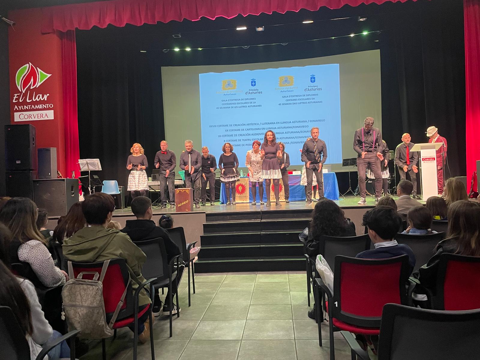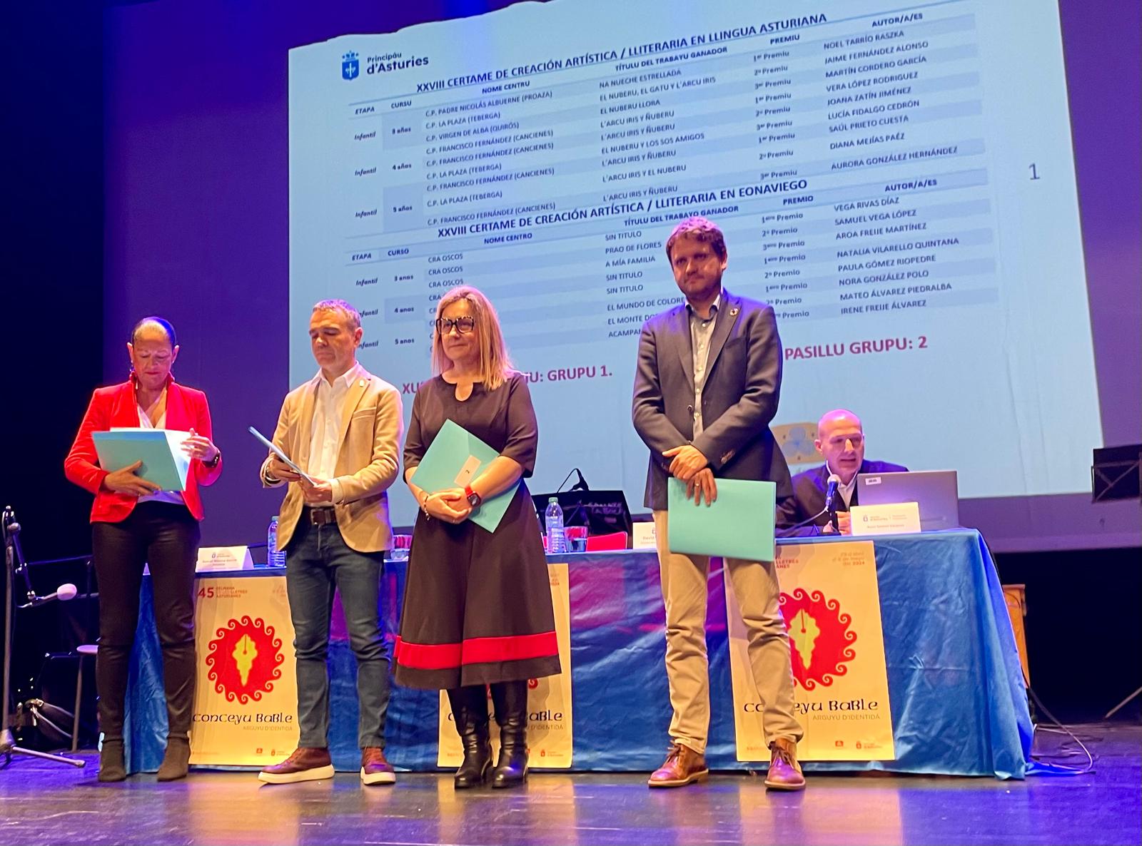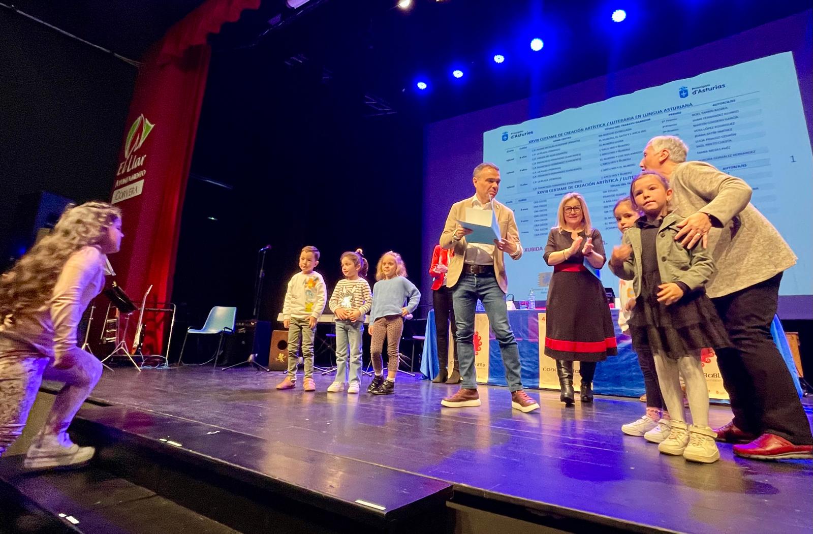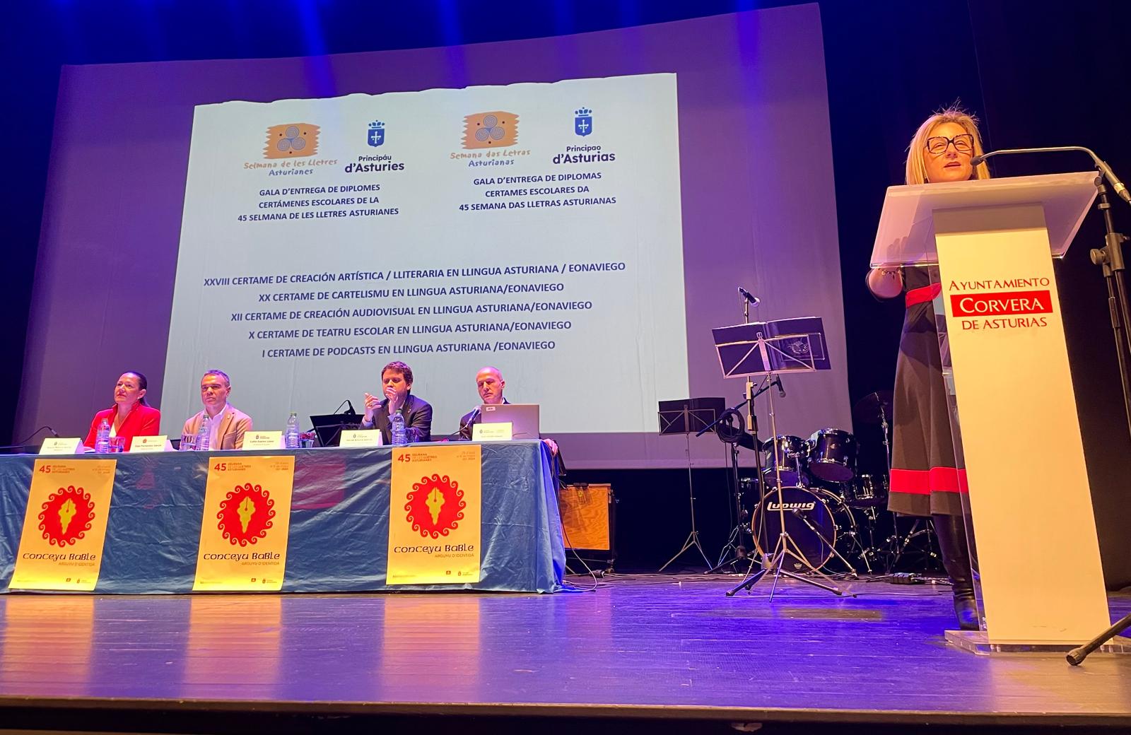 La consejera de Educación, Lydia Espina, ha presidido hoy en Corvera el acto de entrega de diplomas a los ganadores de los cinco certámenes escolares promovidos con motivo de la 45 Selmana de les Lletres Asturianes. A la ceremonia, que se recupera tras su interrupción por causa de la pandemia, han asistido también el alcalde corverano, Iván Fernández; el director general de Inclusión Educativa y Ordenación, David Artime, y la jefa de servicio del Planificación del Asturianu, de la Consejería de Cultura, Política Llingüística y Turismo, Juncal Velasco.