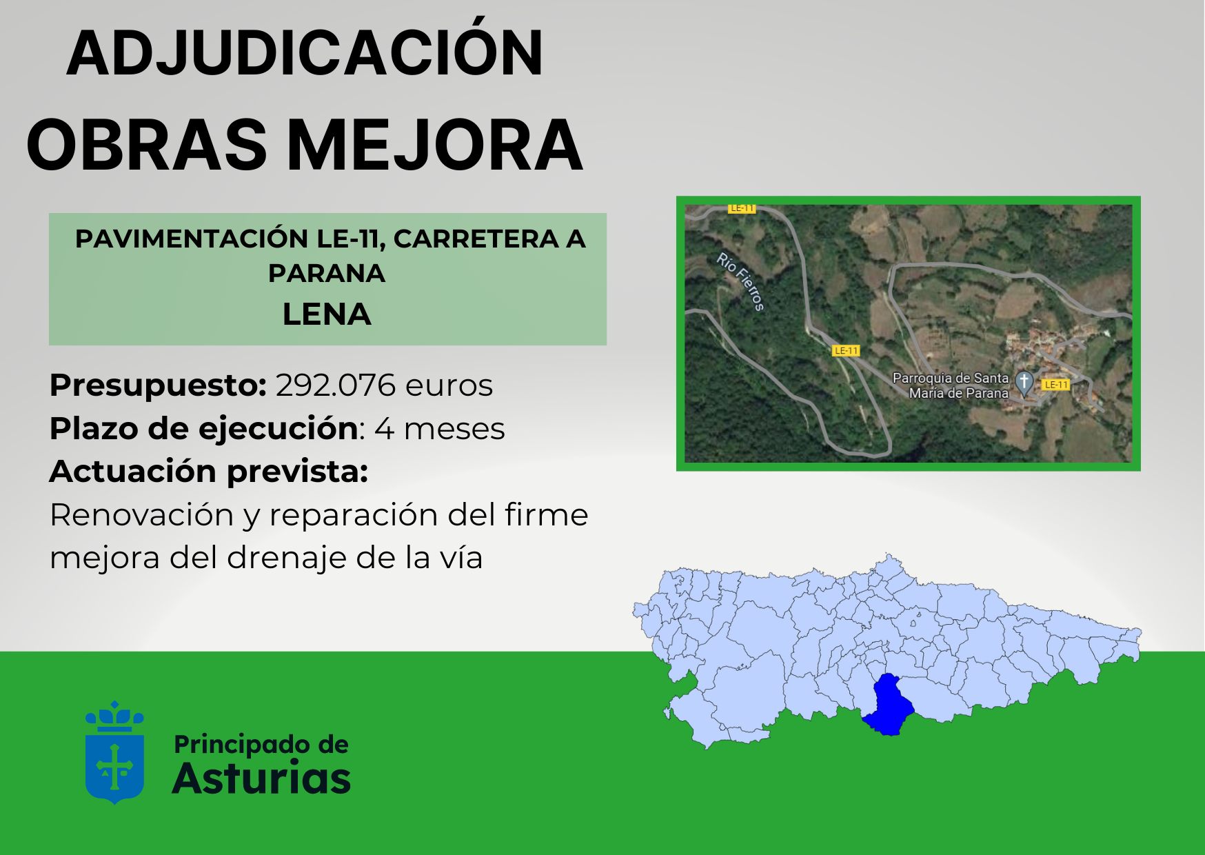 La Consejería de Fomento, Cooperación Local y Prevención de Incendios ha adjudicado las obras para mejorar la pavimentación de la carretera LN-11 de acceso a la localidad de Parana, en Lena. El presupuesto de la inversión asciende a 292.076 euros y el plazo de ejecución de los trabajos, que realizará la empresa Tratamientos Asfálticos S.L., será de 4 meses.