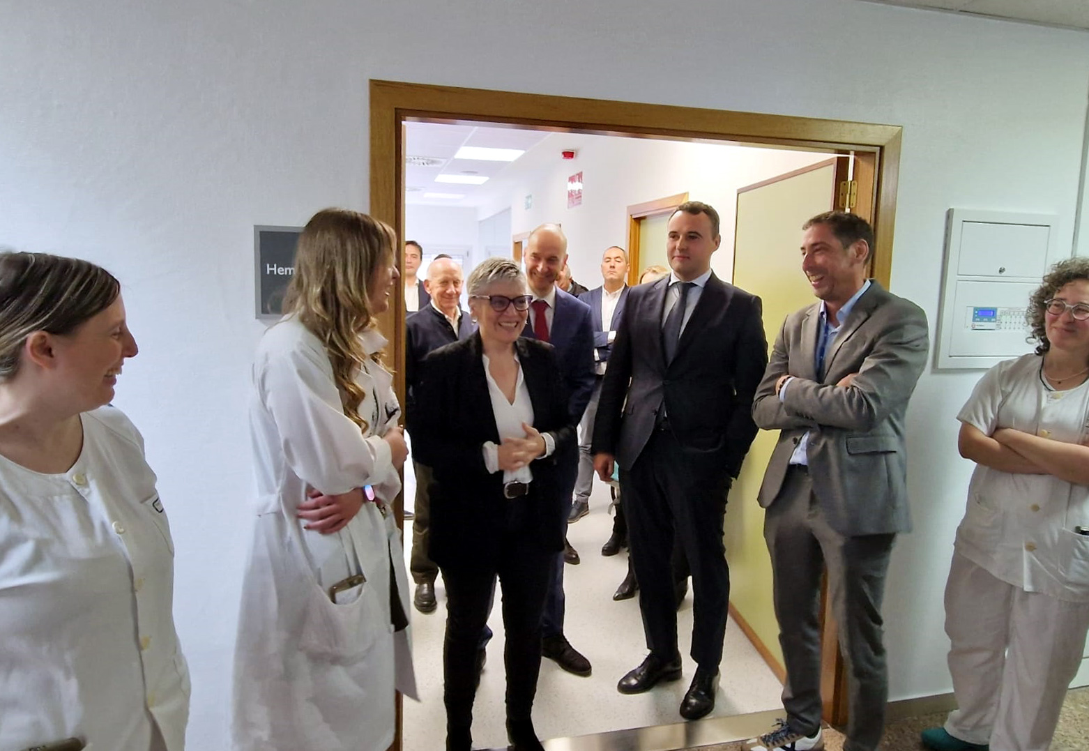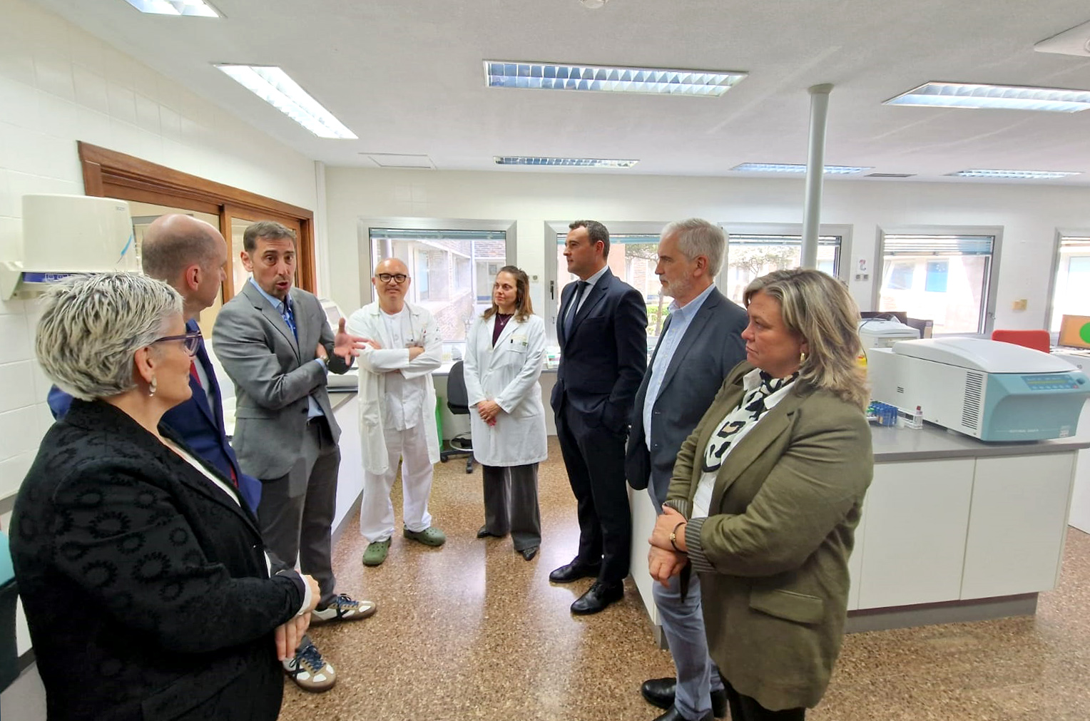 En la imagen (de izqda. a dcha. y de adelante hacia atrás), el consejero de Hacienda, Guillermo Peláez; el hematólogo Manuel Vargas; la consejera de Salud, Concepción Saavedra; la gerente del área sanitaria I, Asunción Artime; el director de Atención Sanitaria y Coordinación Territorial de Jarrio, Pedro Jiménez; el viceconsejero de Politica Sanitaria, Pablo García, y el gerente del Sespa, Aquilino Alonso, en el laboratorio de Hematología.