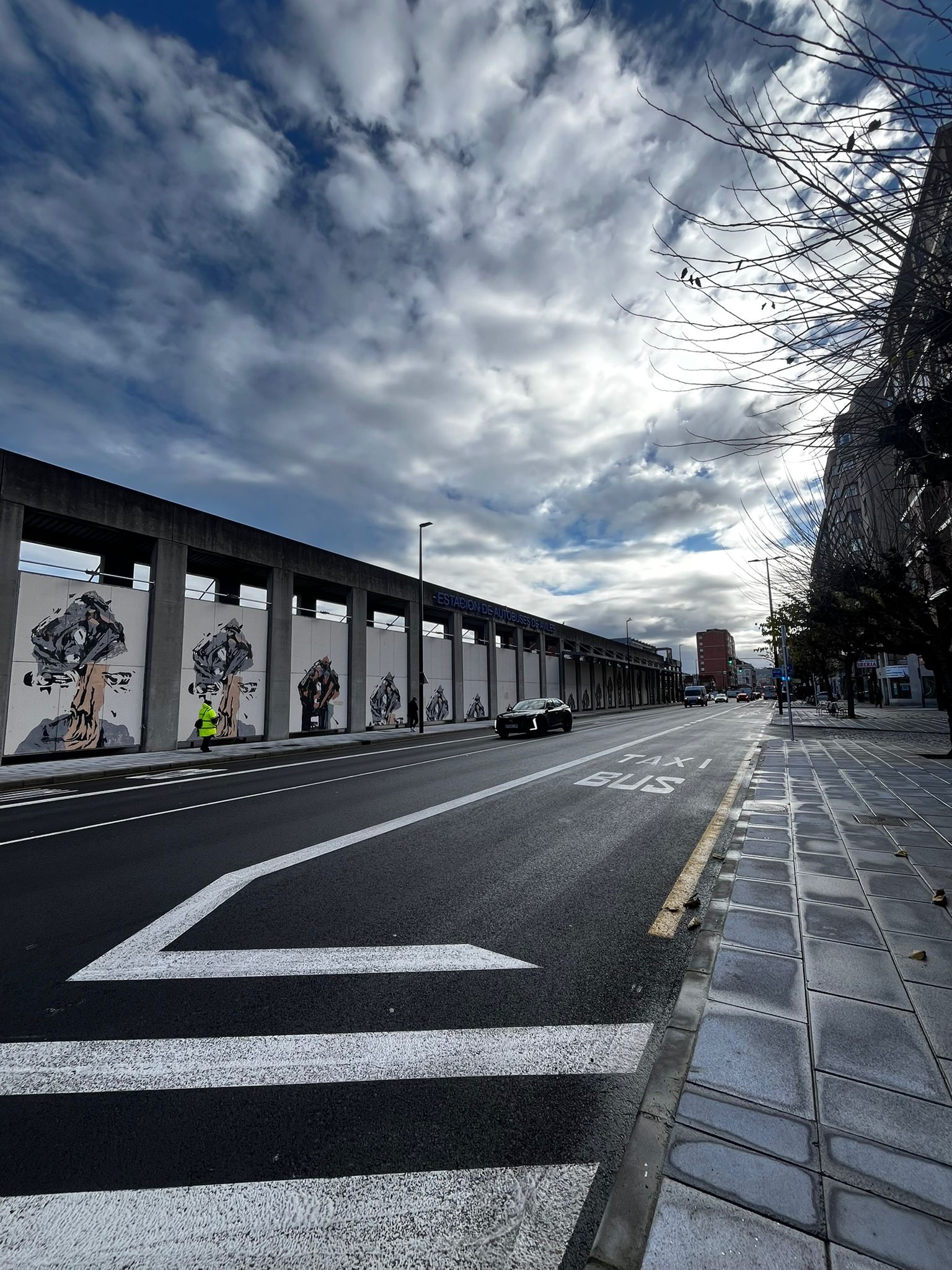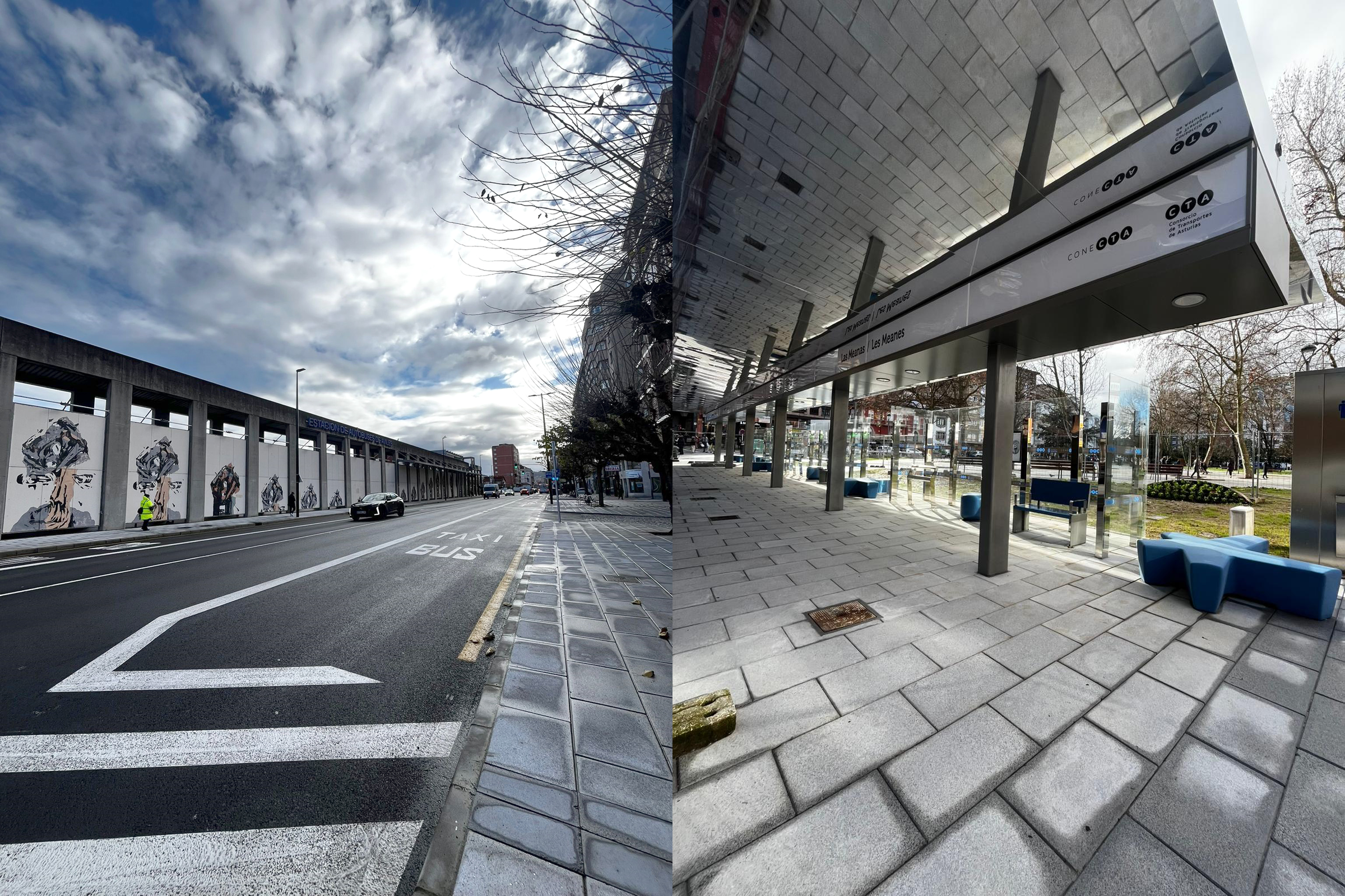 En el caso de la avenida de los Telares, el proyecto ha supuesto la reordenación urbanística de la vía al definir un nuevo carril bus en cada sentido de circulación en el tramo comprendido entre La Estación y la glorieta de acceso a la estación de autobuses. La nueva marquesina, con unas dimensiones de 10,2 por 4,2 metros, integra la obra mural El bosque encantado, del artista avilesino Carlos Suárez.