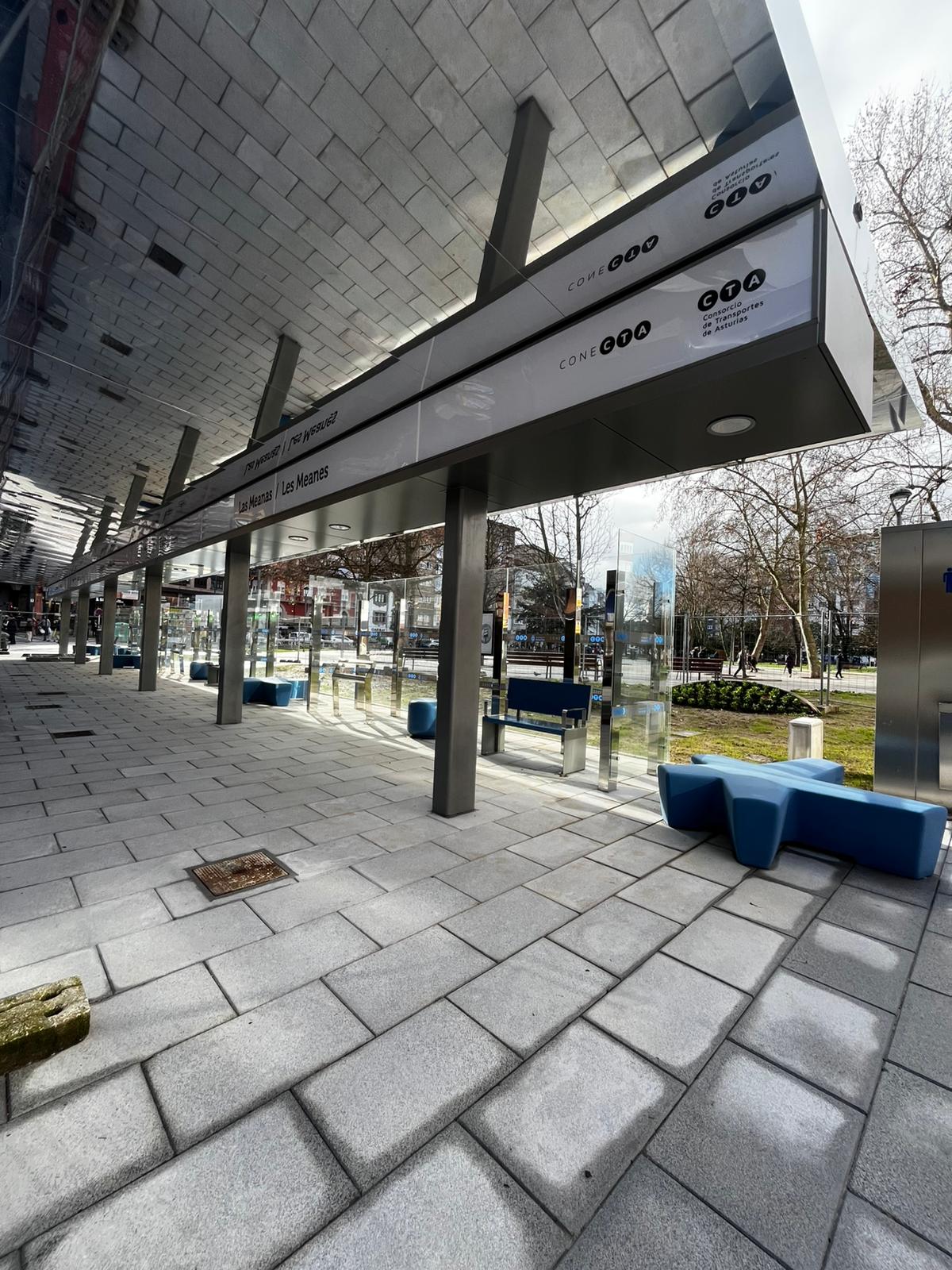 Por su parte, el intercambiador del parque de Las Meanas tiene unas dimensiones de 30,6 por 6 metros y ofrece mayor comodidad a los viajeros.
