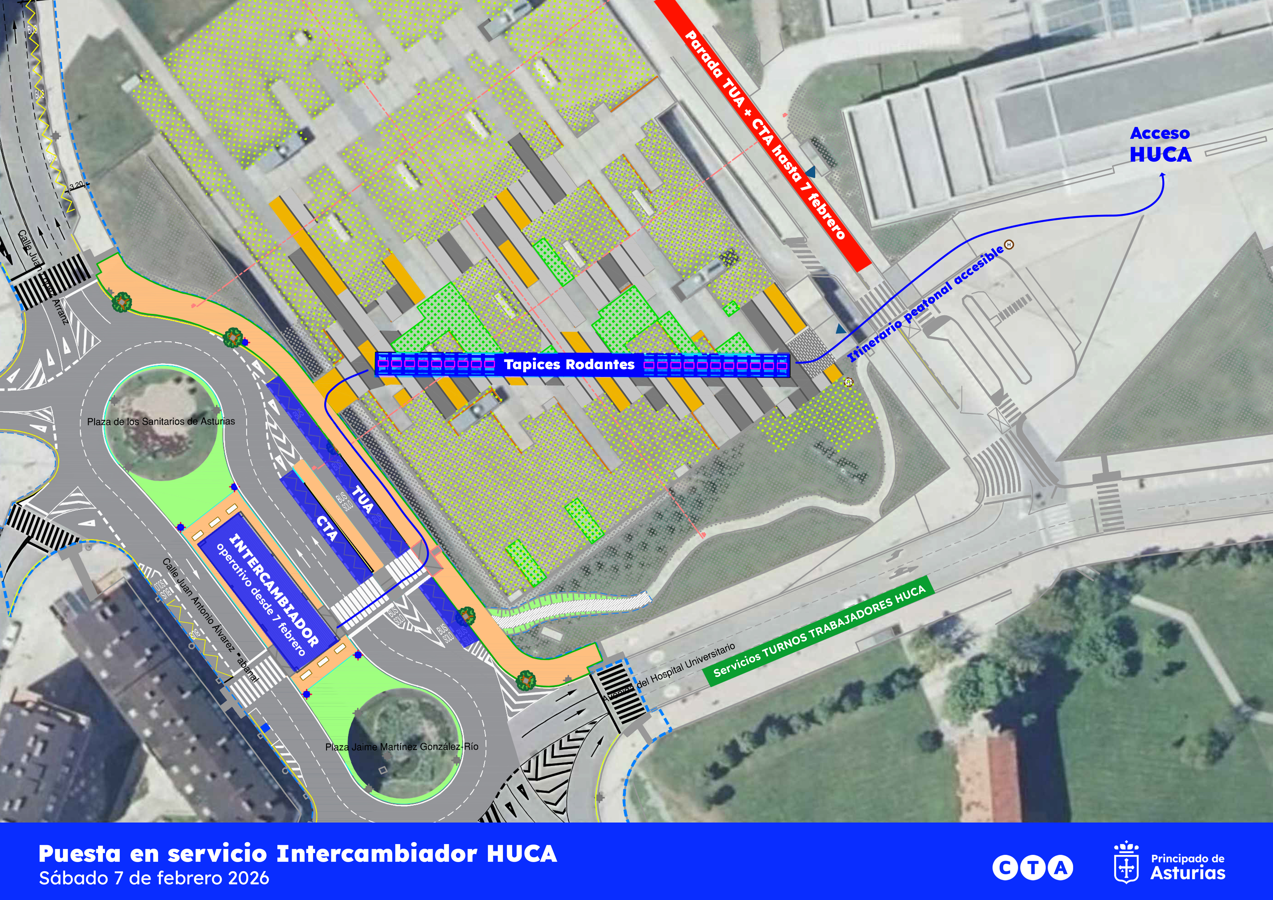 El intercambiador de transporte público del Hospital Universitario Central de Asturias (HUCA) comenzará a funcionar el próximo sábado, día 7 de febrero. La puesta en servicio de este espacio de espera para viajeros implica que las paradas de autobús ubicadas actualmente en la calle Aldea Cerdeño, en el lateral del edifico de Consultas Externas, se trasladen al nuevo equipamiento, situado en la vía Juan Antonio Álvarez Rabanal.