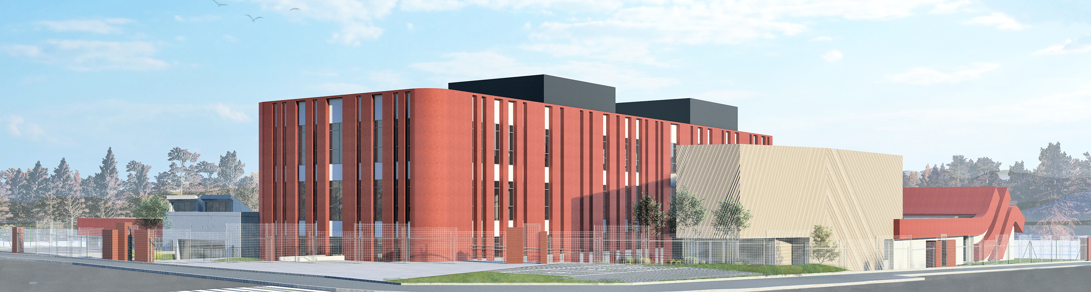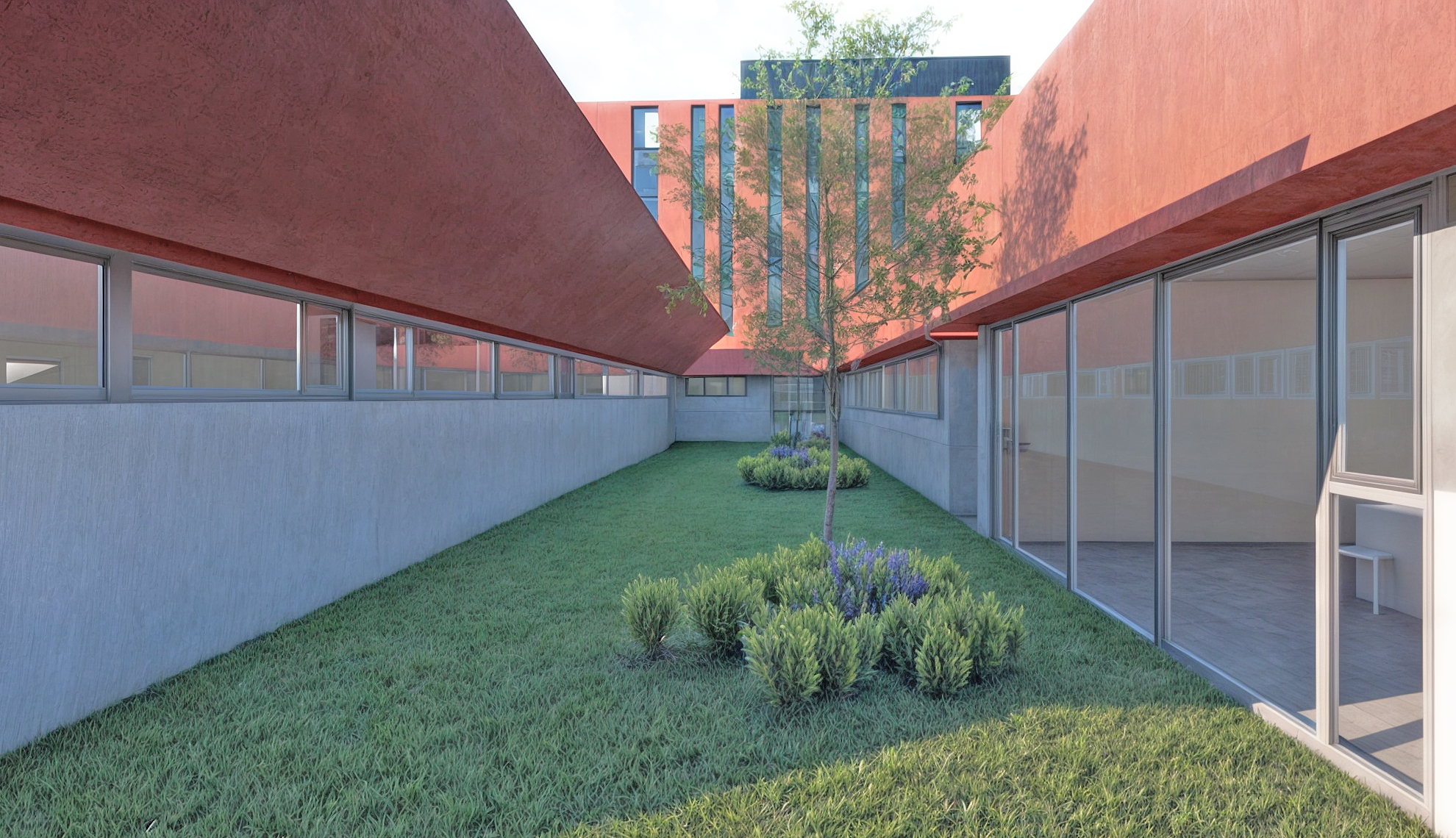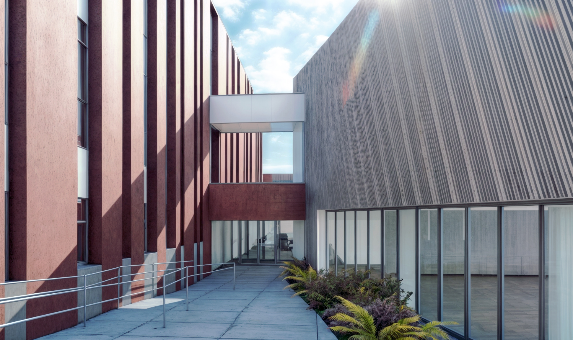 Entre las edificaciones de ambas fases, se habilitará a nivel de planta baja un patio interior para facilitar tanto la iluminación natural como la evacuación. Por su parte, las edificaciones en altura quedarán integradas entre sí y con las fachadas alineadas. Para ello, se utilizarán los mismos materiales de revestimiento exterior (acero corten y vidrio).