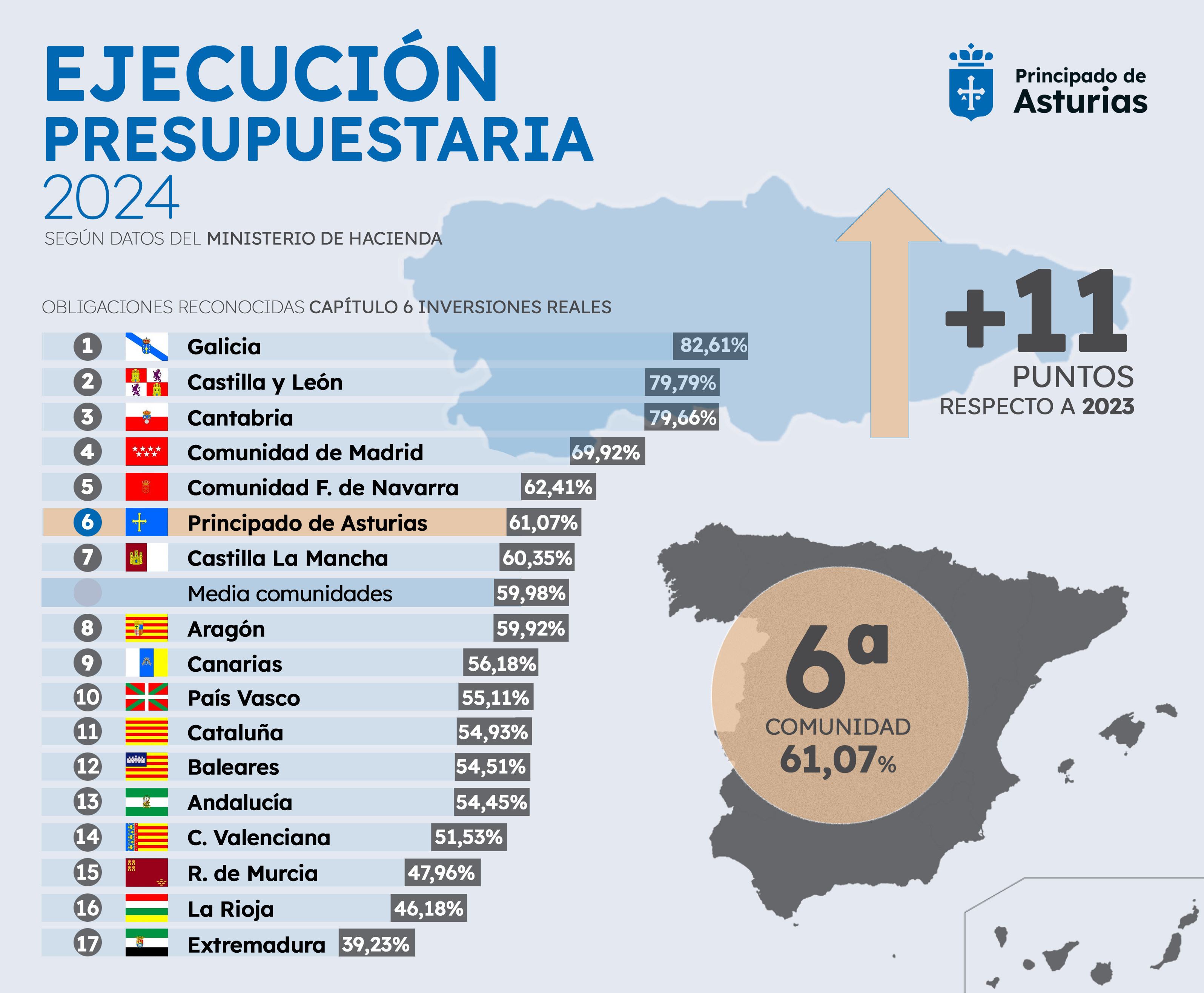 La ejecución de las inversiones directas situó a Asturias entre las comunidades con el porcentaje más alto de cumplimiento presupuestario en 2024. Según los últimos datos publicados por el Ministerio de Hacienda, el Principado fue la sexta autonomía con mejores números al registrar una ejecución del 61,07%, un punto superior a la media nacional (59,98%)