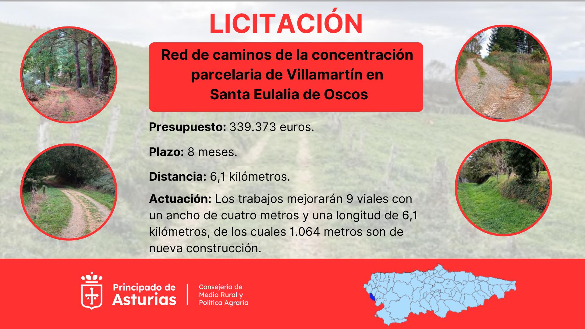 La Consejería de Medio Rural y Política Agraria ha licitado la construcción de la red de caminos de la concentración parcelaria de Villamartín, en Santa Eulalia de Oscos, con un presupuesto de 339.373 euros y un plazo de ocho meses. Las empresas interesadas podrán presentar sus ofertas hasta el próximo jueves, día 29 de enero.