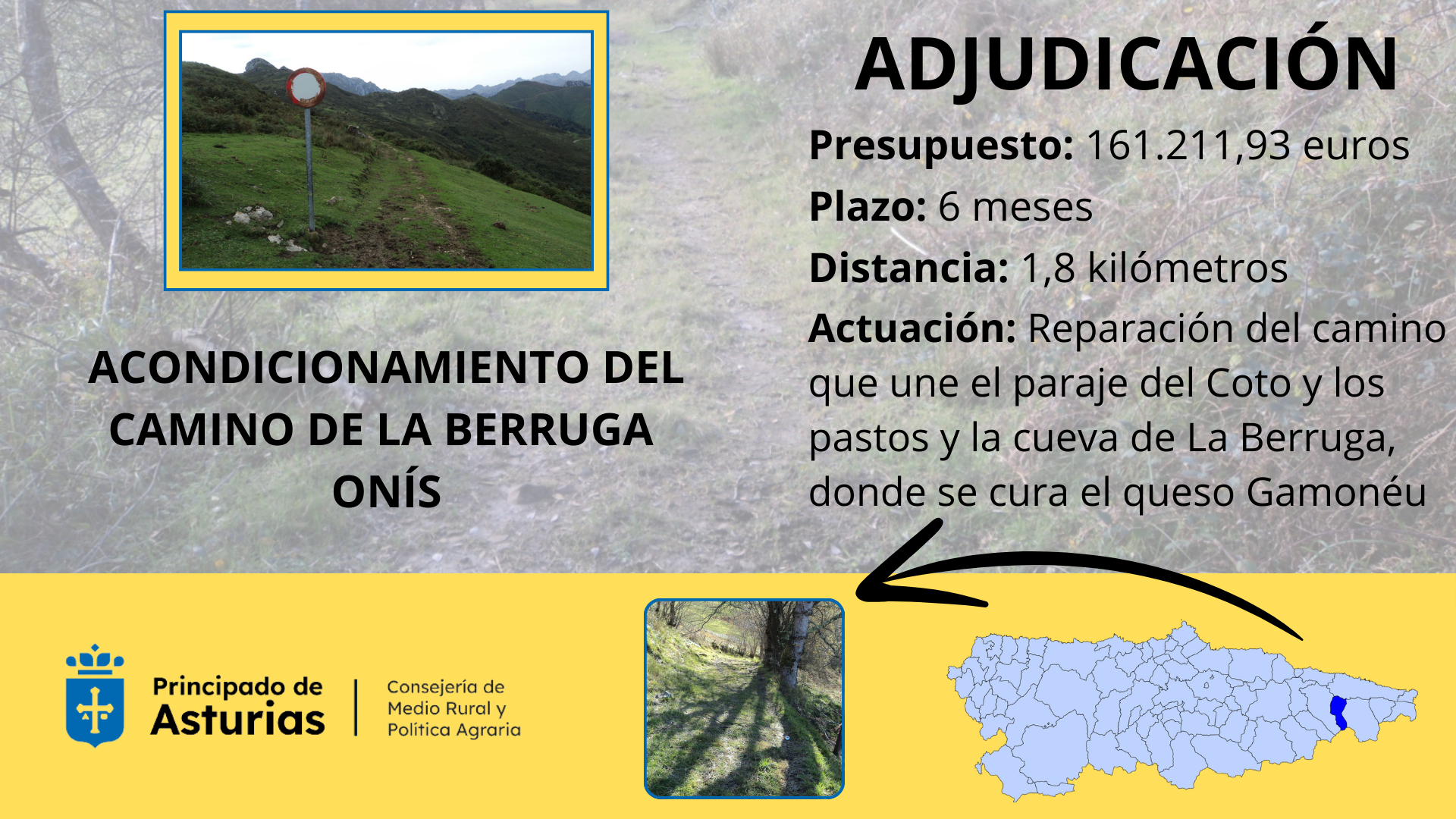 La Consejería de Medio Rural y Política Agraria ha adjudicado en 161.211,93 euros el acondicionamiento del camino de La Berruga, en el concejo de Onís, a la empresa Contratas y Excavaciones Fontexina S.L, con un plazo de ejecución de seis meses. El Fondo Europeo Agrario de Desarrollo Rural (Feader) financia el 60% de la reforma.
