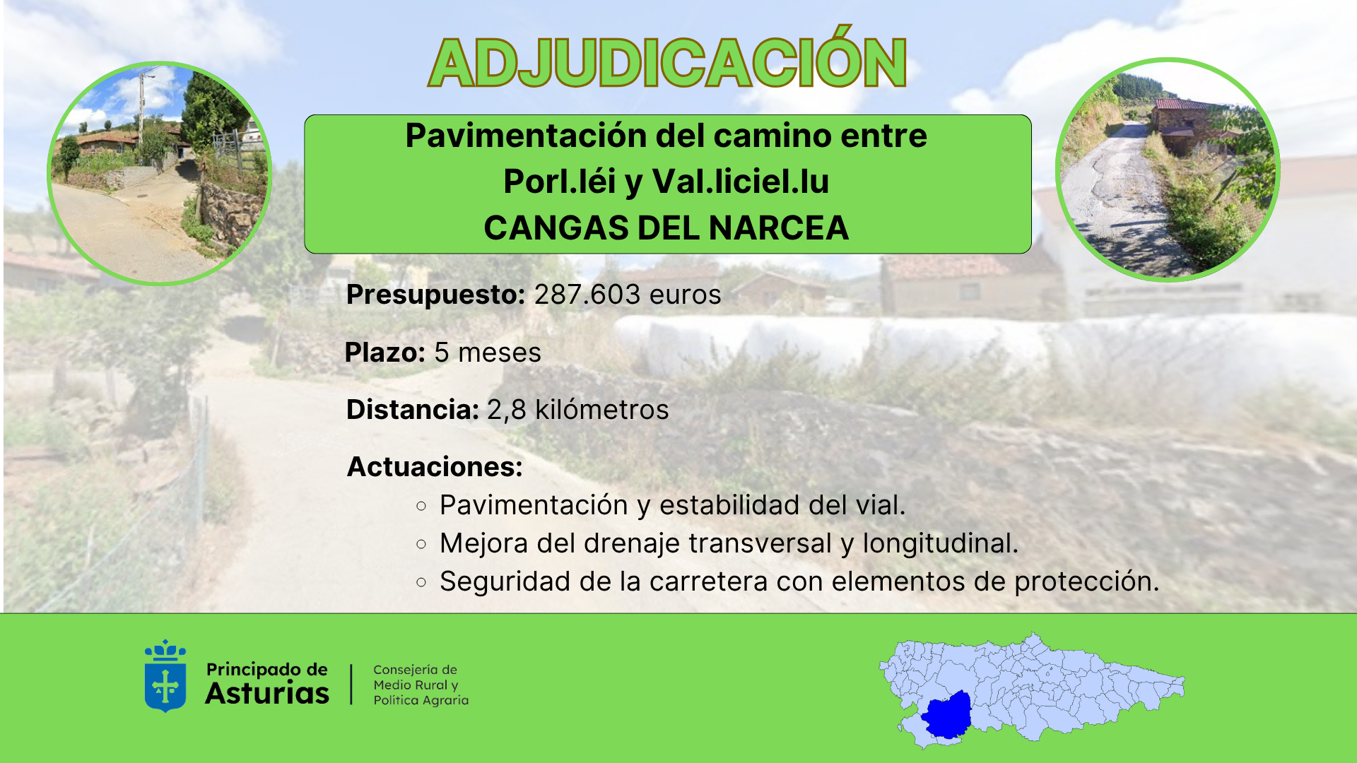 La Consejería de Medio Rural y Política Agraria ha adjudicado en 287.603 euros las obras de pavimentación del camino entre Porl.léi y Val.liciel.lu, en el concejo de Cangas del Narcea. Las obras en este vial de 2.875 metros, ubicado en una zona de concentración parcelaria, resolverán las deficiencias actuales y mejorarán el camino, lo que beneficiará a la población de ambas localidades y a la de otras interconectadas como Ounón.