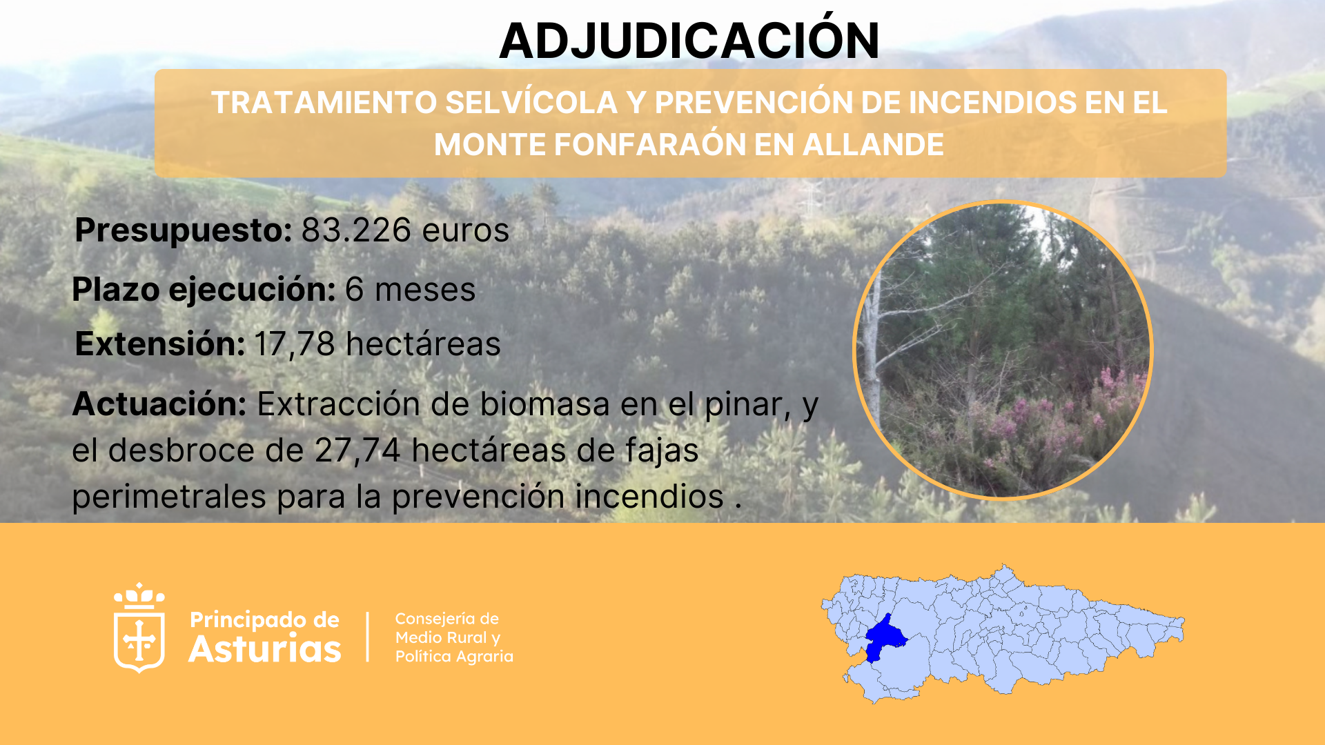 La Consejería de Medio Rural y Política Agraria ha adjudicado por 83.226 euros la ejecución de tratamientos silvícolas en 17,78 hectáreas del monte Fonfaraón, en el municipio de Allande. Esta actuación, que se desarrollará en un plazo de seis meses, permitirá extraer biomasa para reducir el riesgo de incendios forestales y favorecer el crecimiento de los árboles. De este modo, mejorará la calidad de la madera.