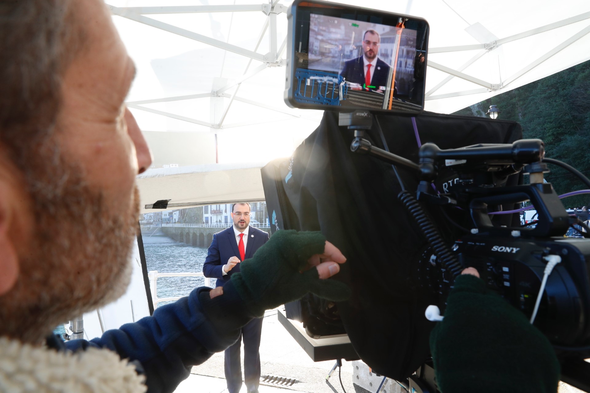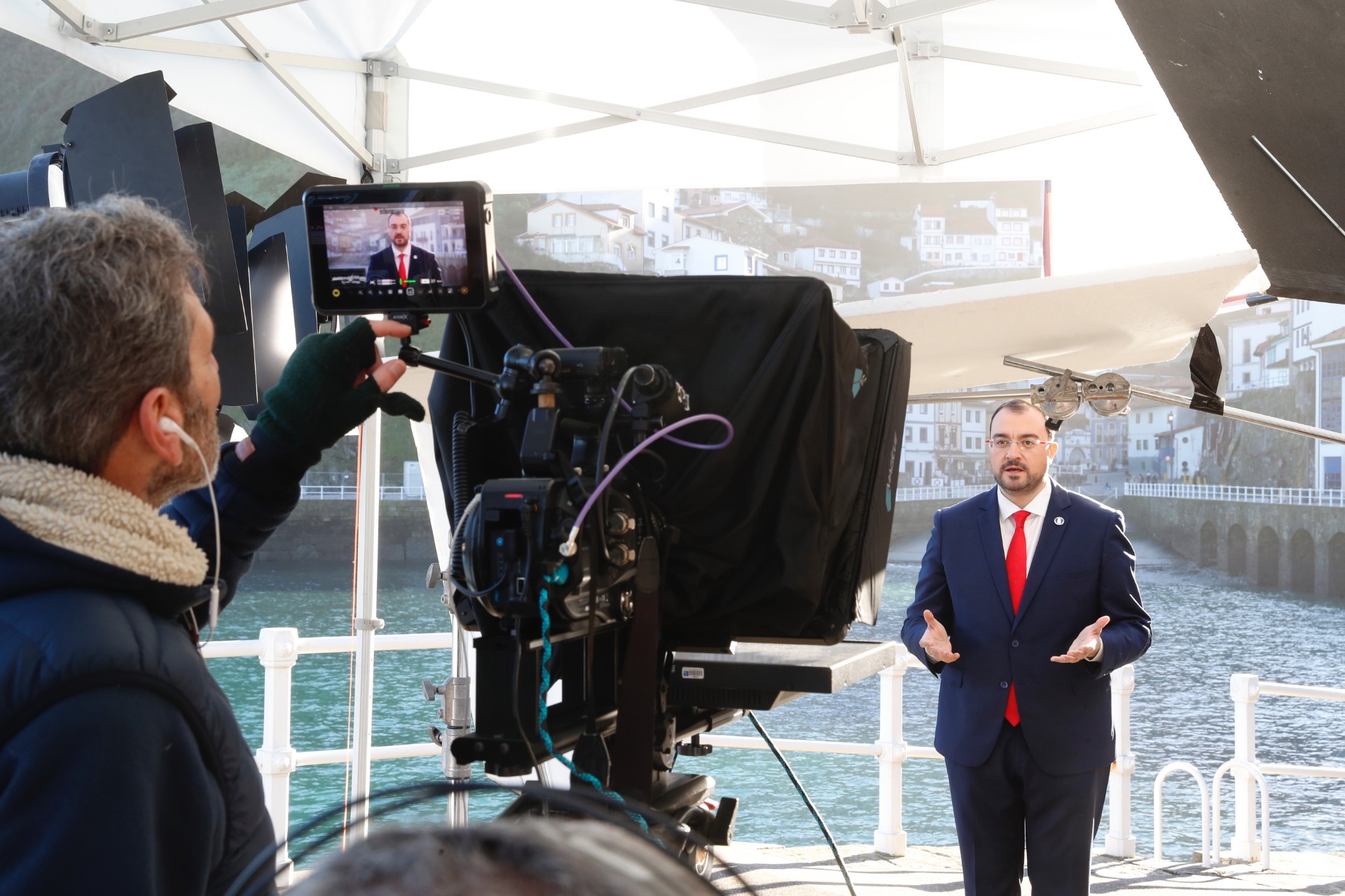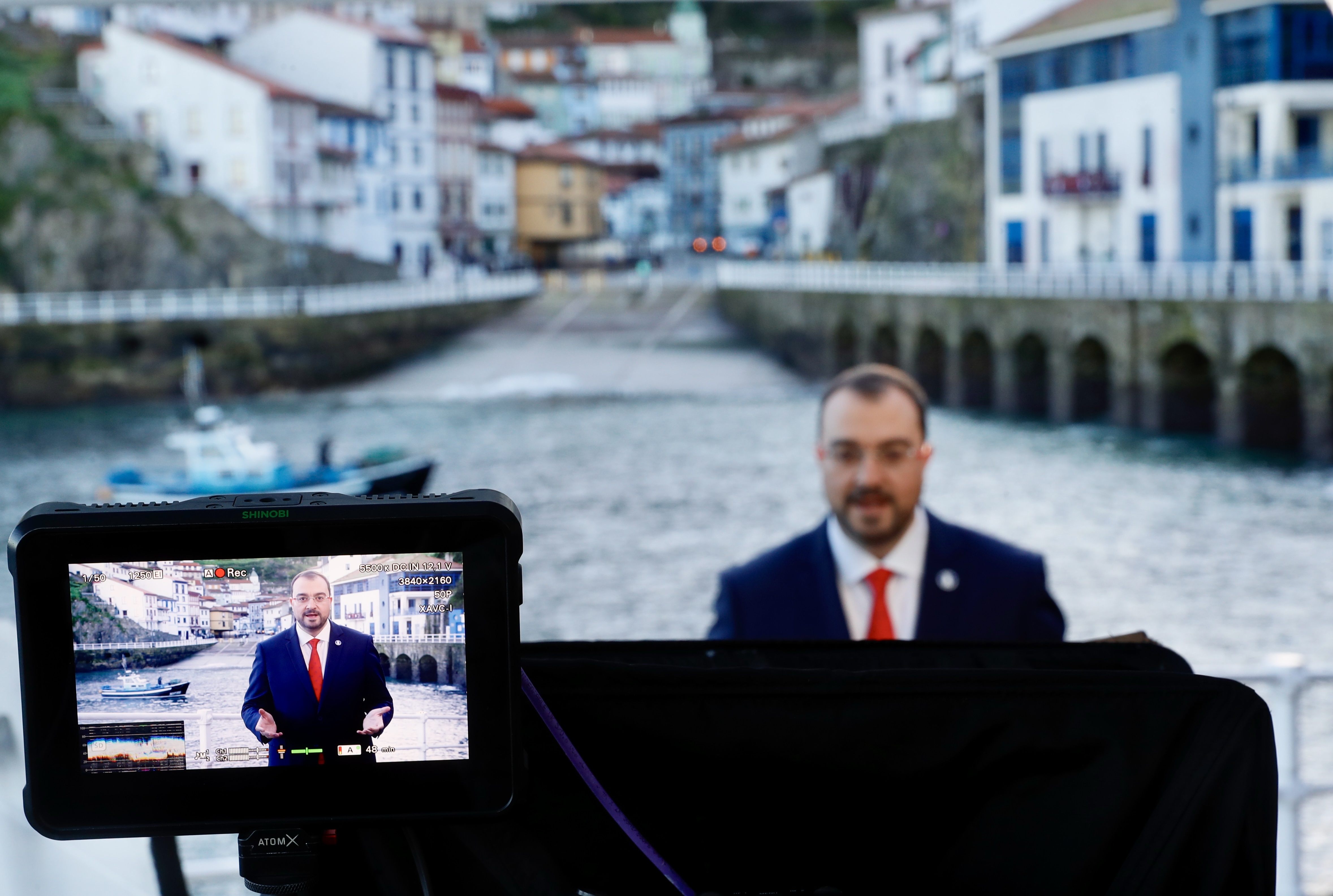 El presidente del Principado de Asturias, Adrián Barbón, durante la grabación en Cudillero del mensaje de fin de año.