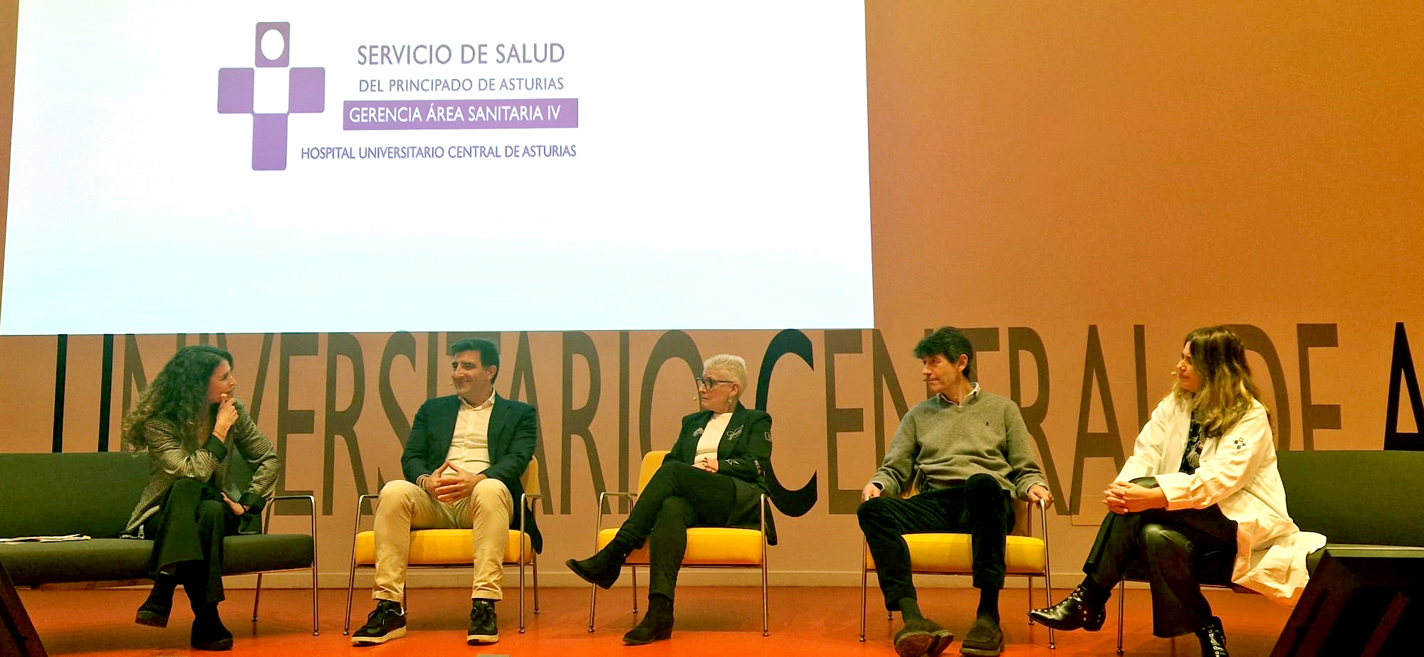 Pie de foto: de izquierda a derecha, La moderadora del acto, Paloma F.Llera; el director y productor de la película, Pedro Lendínez; la consejera de Salud, Concepción Saavedra; el jefe de Servicio de Salud Poblacional, José María Blanco, y la subdirectora de Servicios Básicos del HUCA, Alejandra Fernández.
