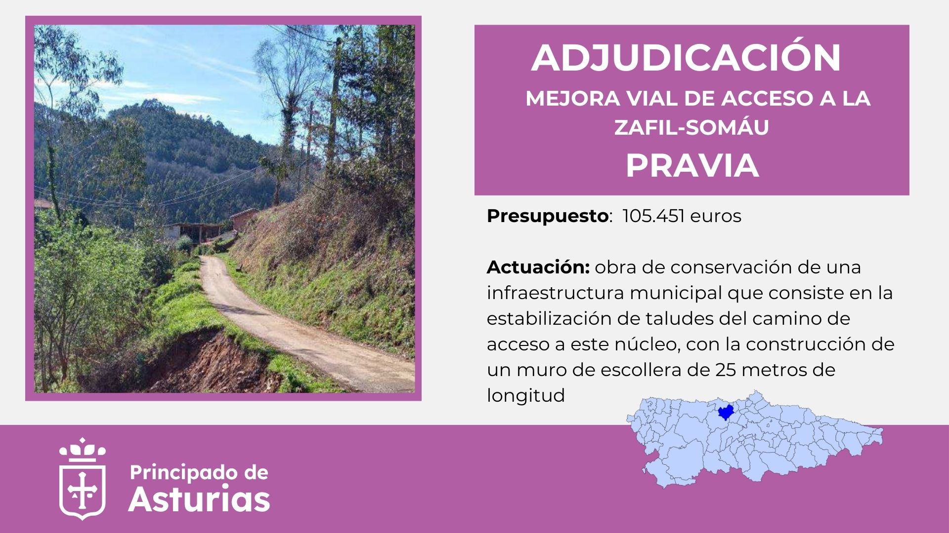 La Consejería de Movilidad, Medio Ambiente y Gestión de Emergencias ha adjudicado a la a la empresa Solveser S.L. las obras de mejora del vial de acceso a La Zafil-Somáu, en Pravia, por 105.451 euros.