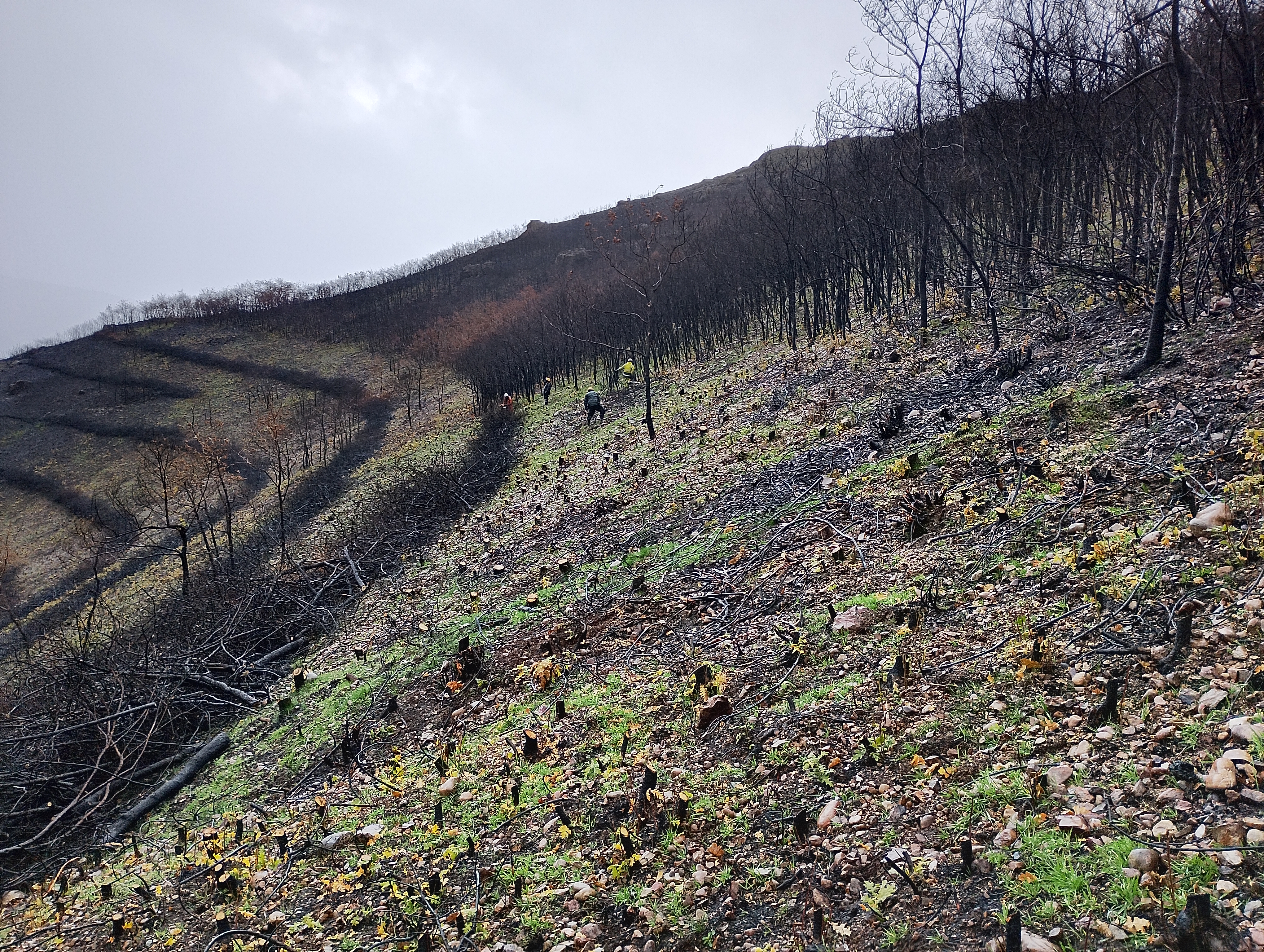 Estas intervenciones se desarrollan dentro del proyecto de restauración hidrológico‑forestal declarado de emergencia a finales de noviembre de 2025. Los incendios dañaron 1.882,5 hectáreas de montes de gestión pública, de las cuales 56,27 pertenecen al monte de Acebales. En esta zona, especialmente vulnerable por la fuerte pendiente y a la pérdida de cobertura vegetal, los trabajos comenzaron en diciembre de 2025. La intervención inicial consistió en la corta manual del arbolado quemado y en el acordonado de restos, dispuestos de forma discontinua siguiendo las curvas de nivel. Estos cordones actúan como barreras que ralentizan la escorrentía superficial y retienen sedimentos.
