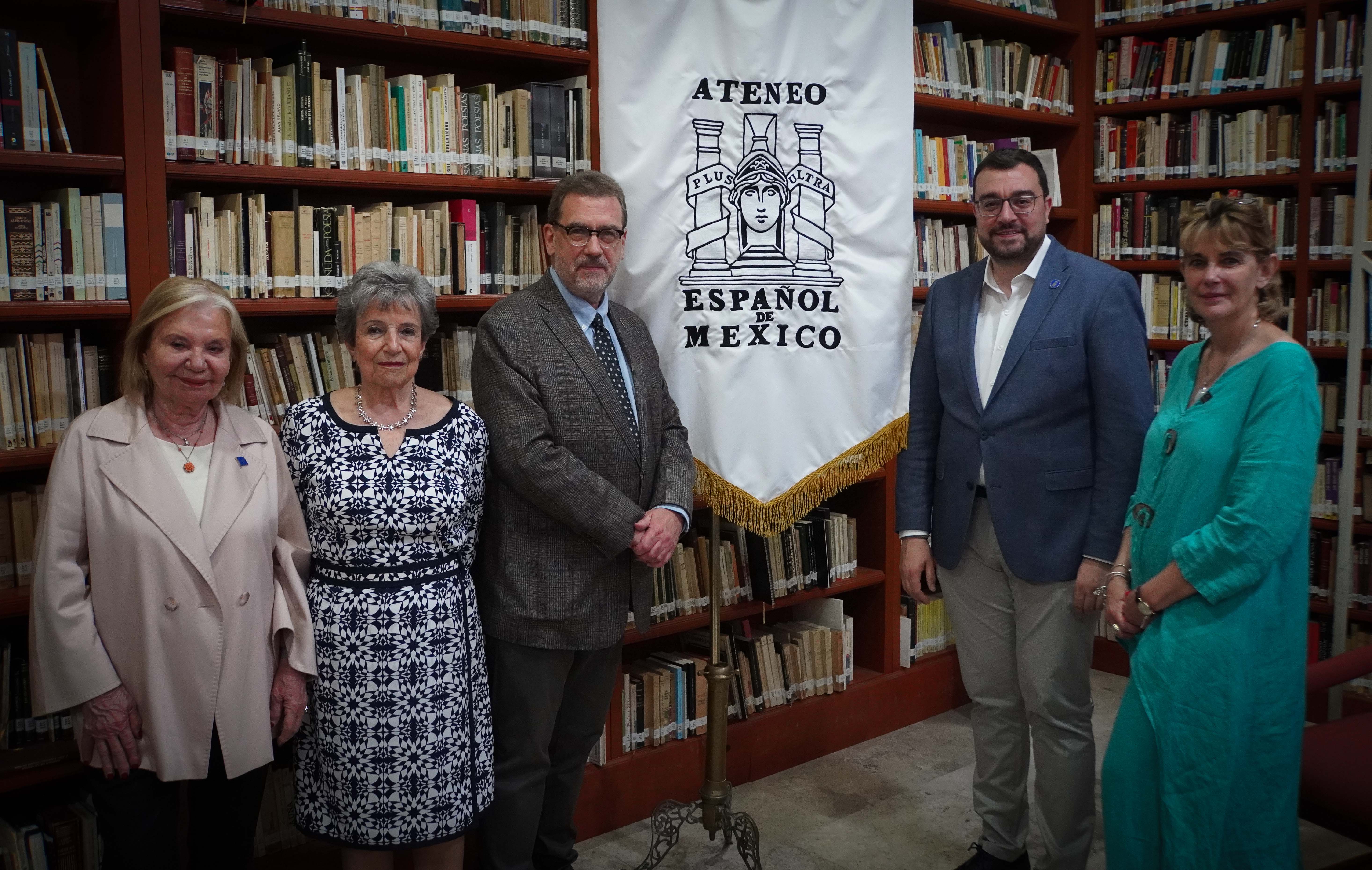 La presidenta del Consejo de Comunidades Asturianas, María Antonia Fernández; el presidente del Ateneo Español en México, Juan Luis Bonilla; el presidente del Principado de Asturias, y Adrián Barbón, y la secretaria del Ateneo Español en México, Cristina Ruiz.